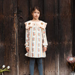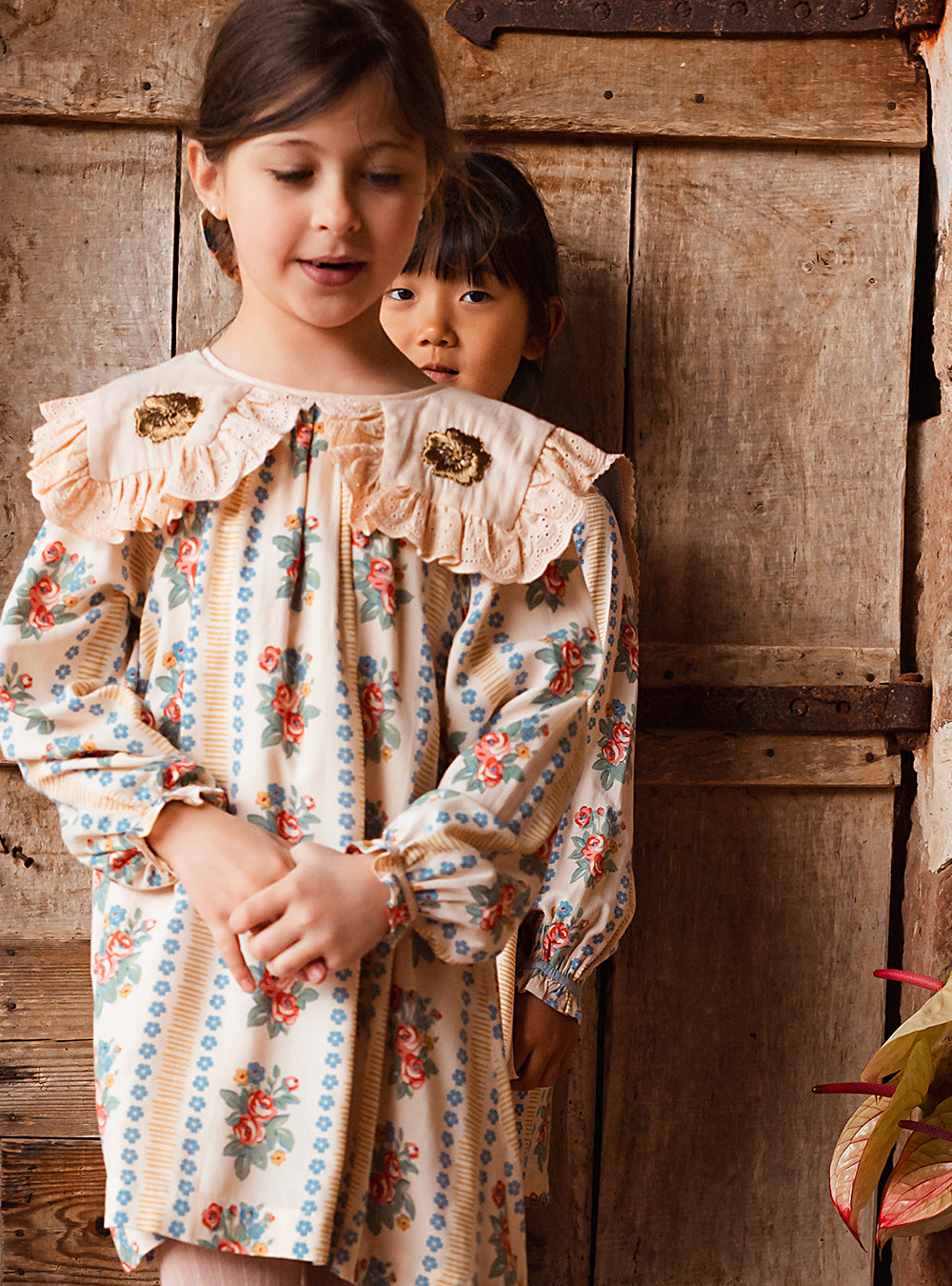 · Oversized sailor collar with ruffled trim and embroidered flower details