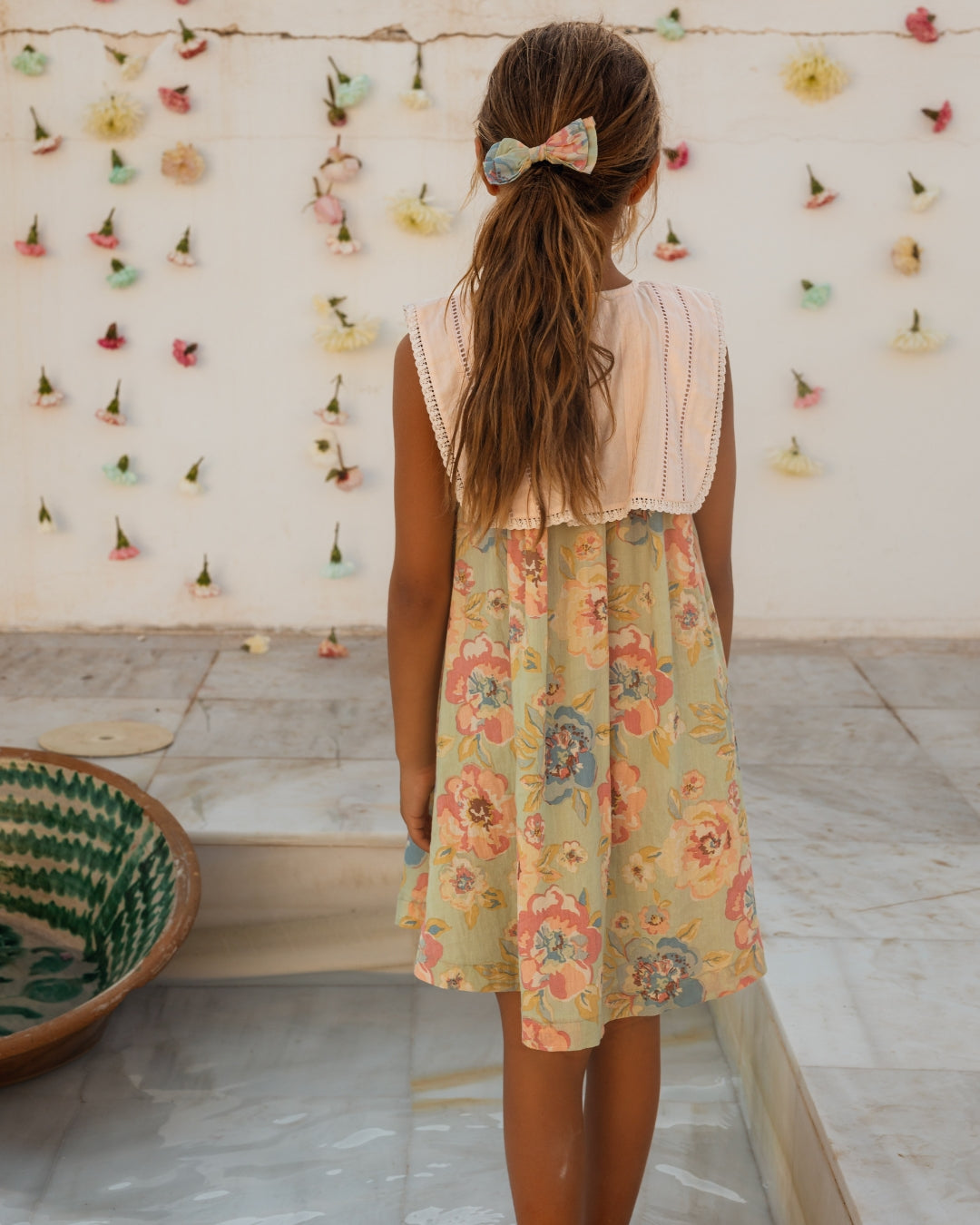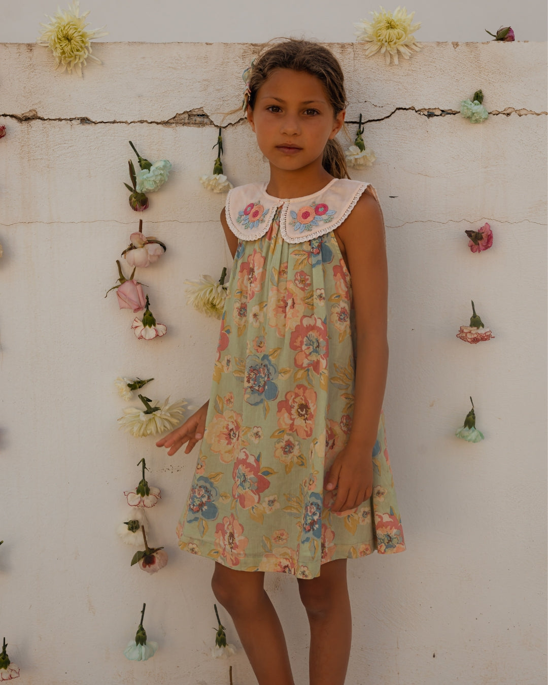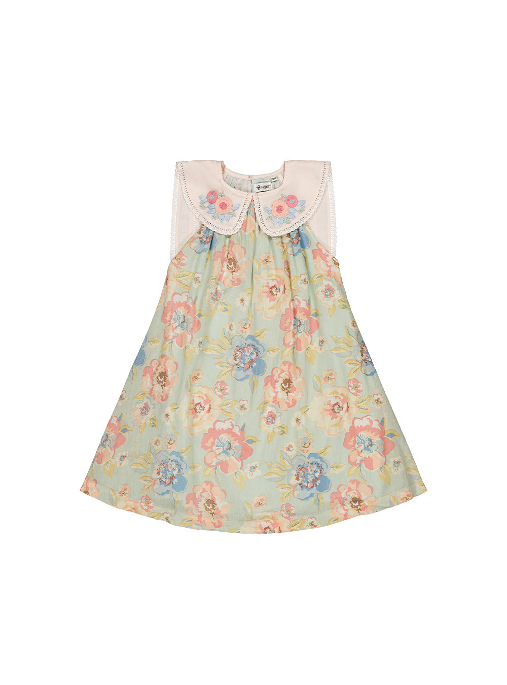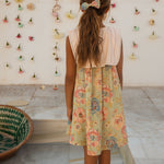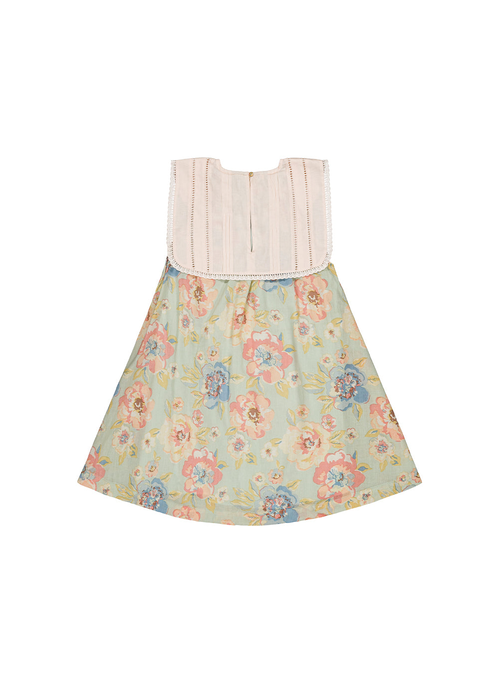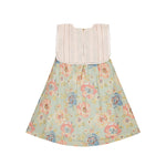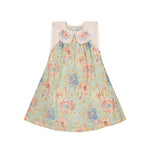 · Vintage-inspired floral dress in soft sage with pastel blooms