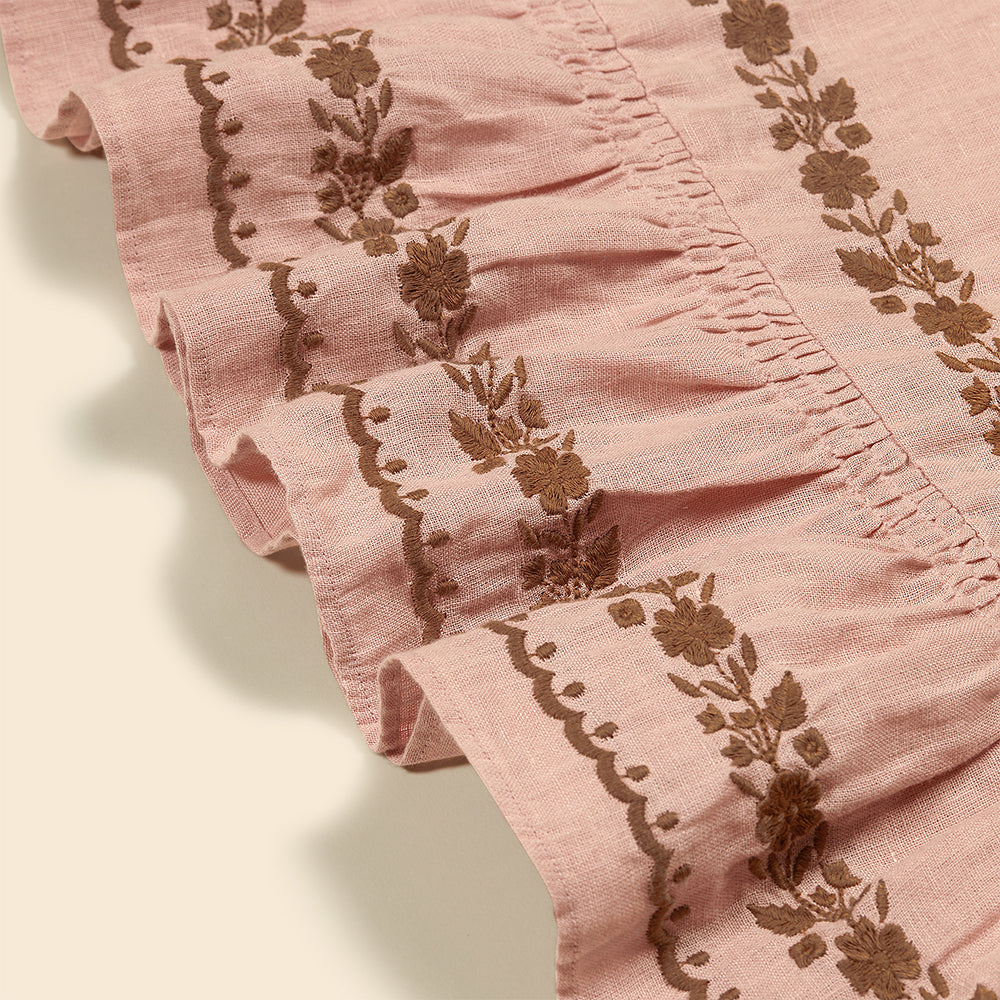 · Scallop and floral embroideries in frill skirt and the neckline