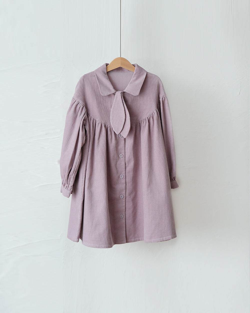 · A soft corduroy dress in muted lavender