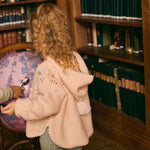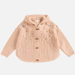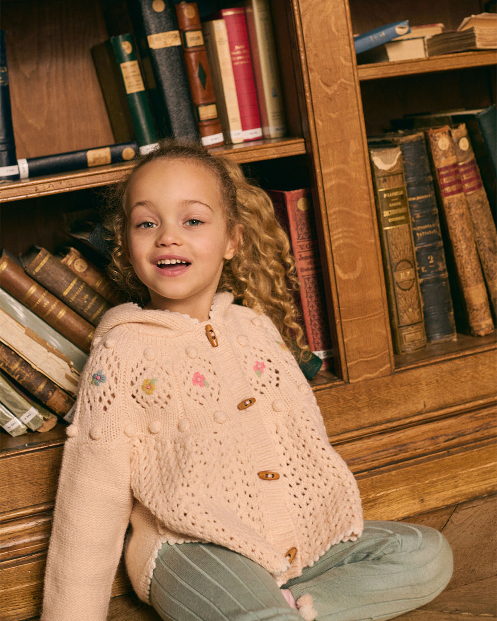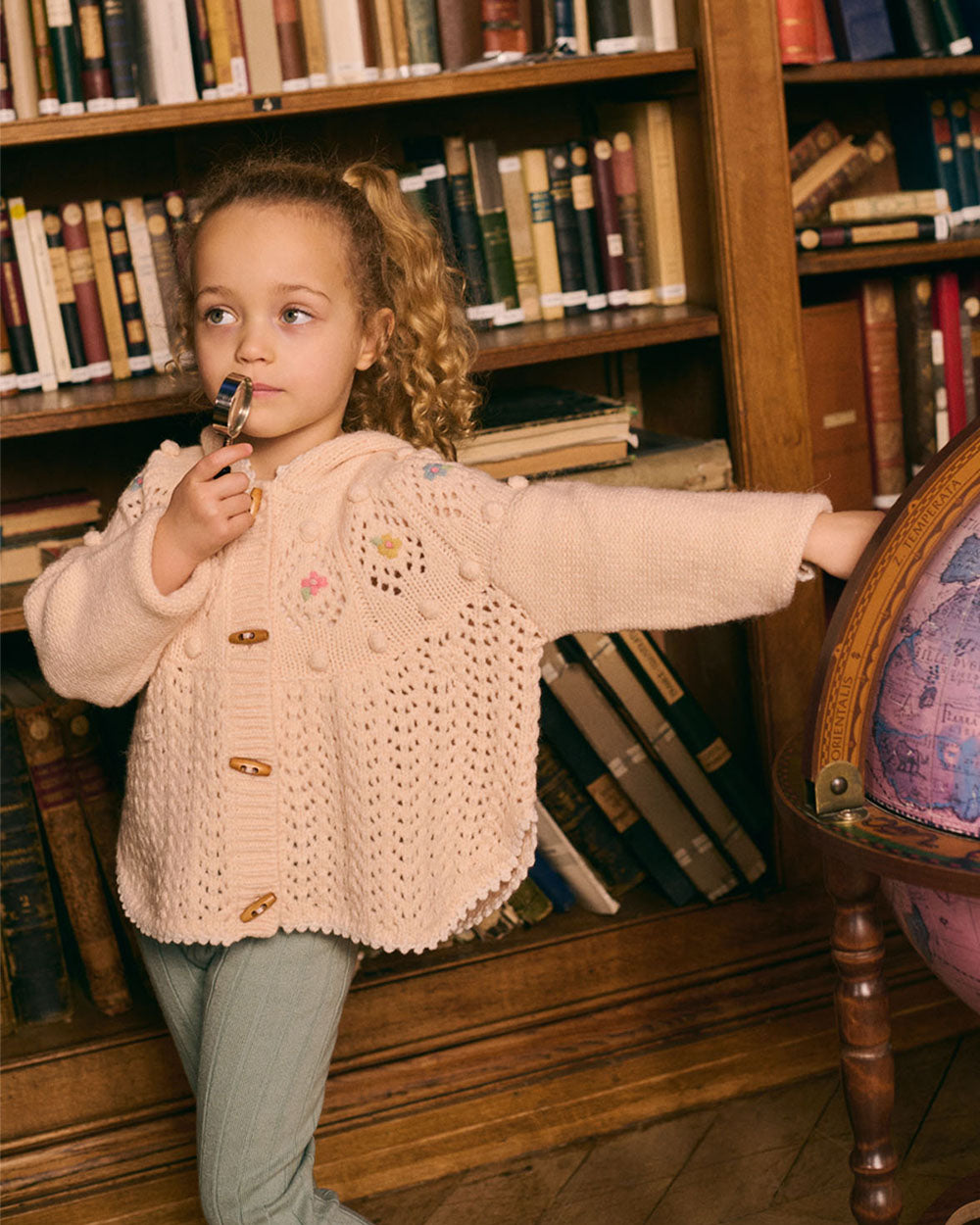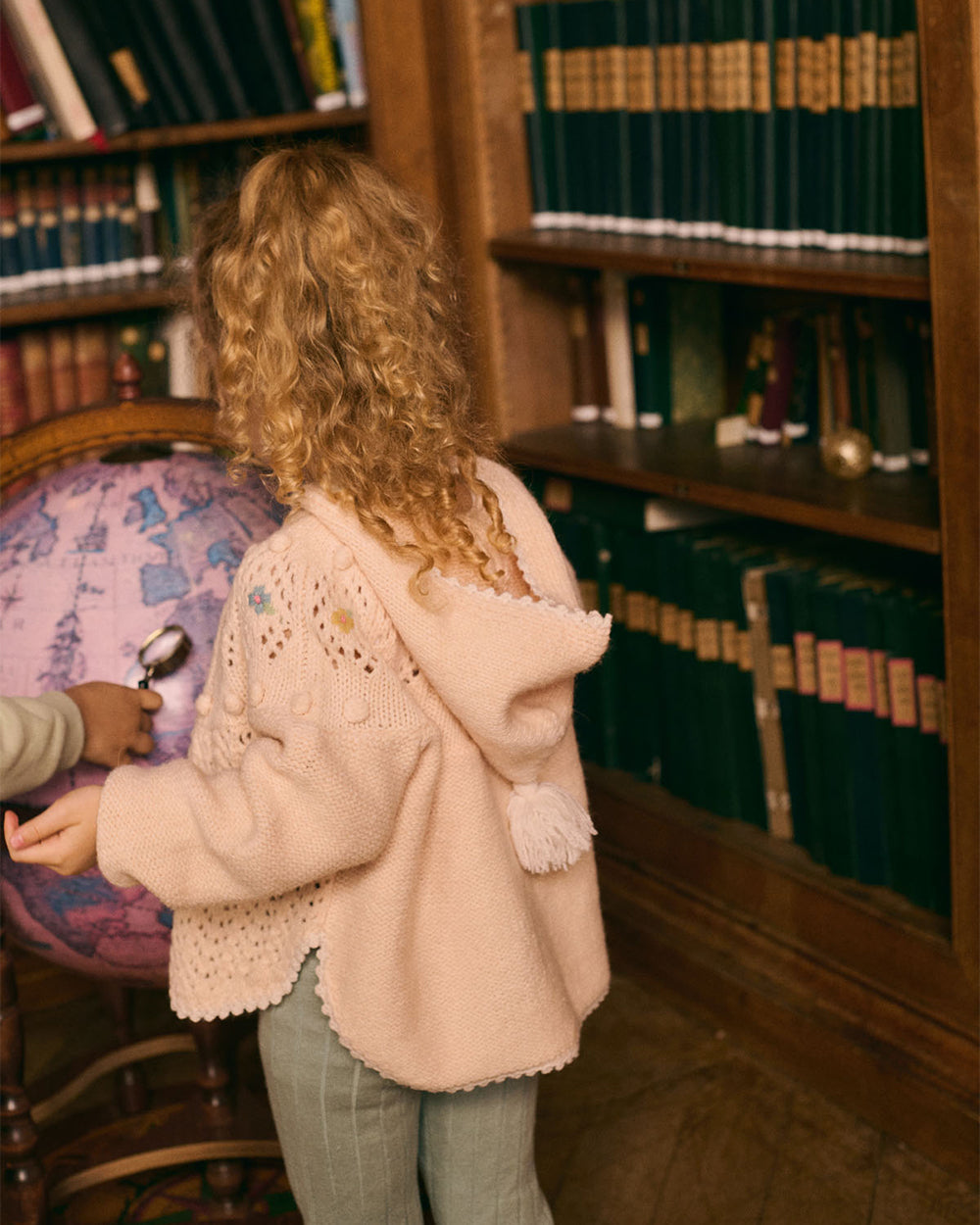 · Hood with hand-crocheted scalloped edges and handmade pompom