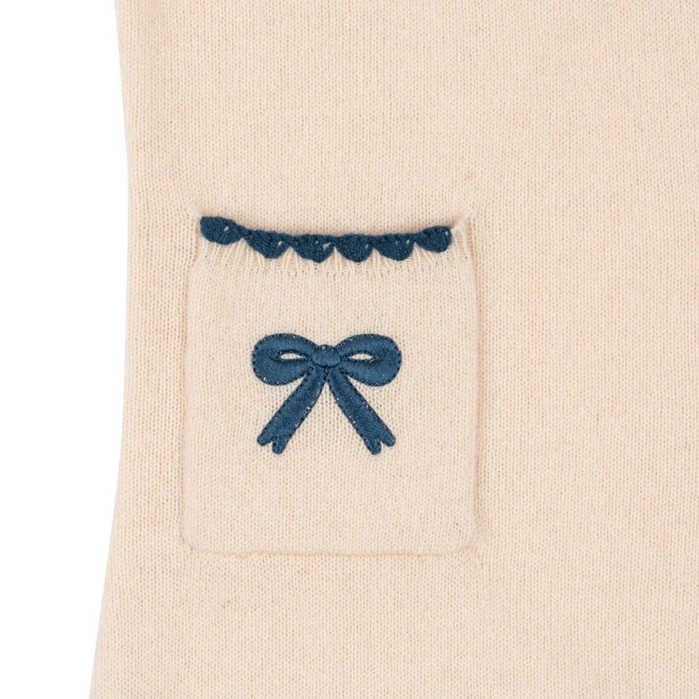 · Soft and warm wool dress with contrast stitching along hems and embroidered bows.