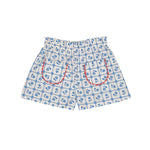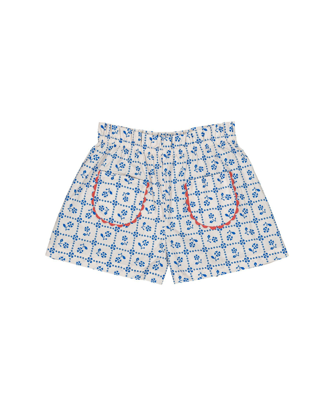 · Blue tile-inspired print shorts with vintage charm