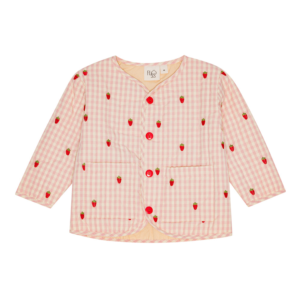 · Pink gingham pattern adorned with embroidered strawberries