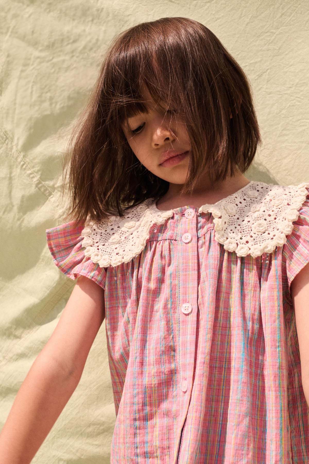 · Decorative crochet lace collar with front button closure