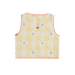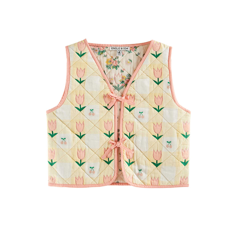 · Quilted vest with pink tulip embroidery complemented by delicate smaller flowers