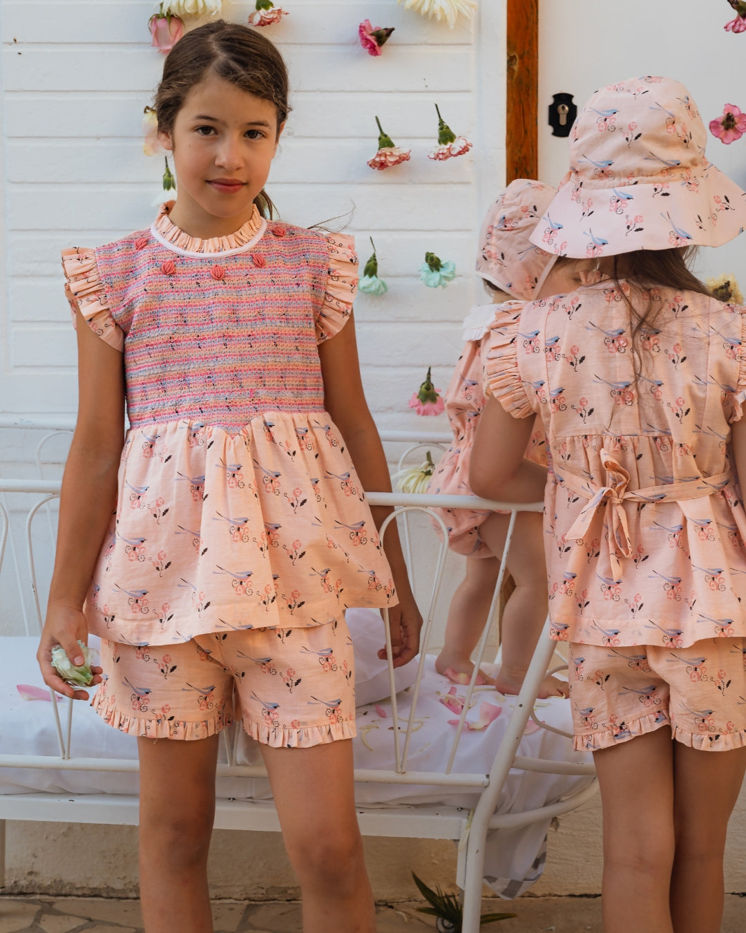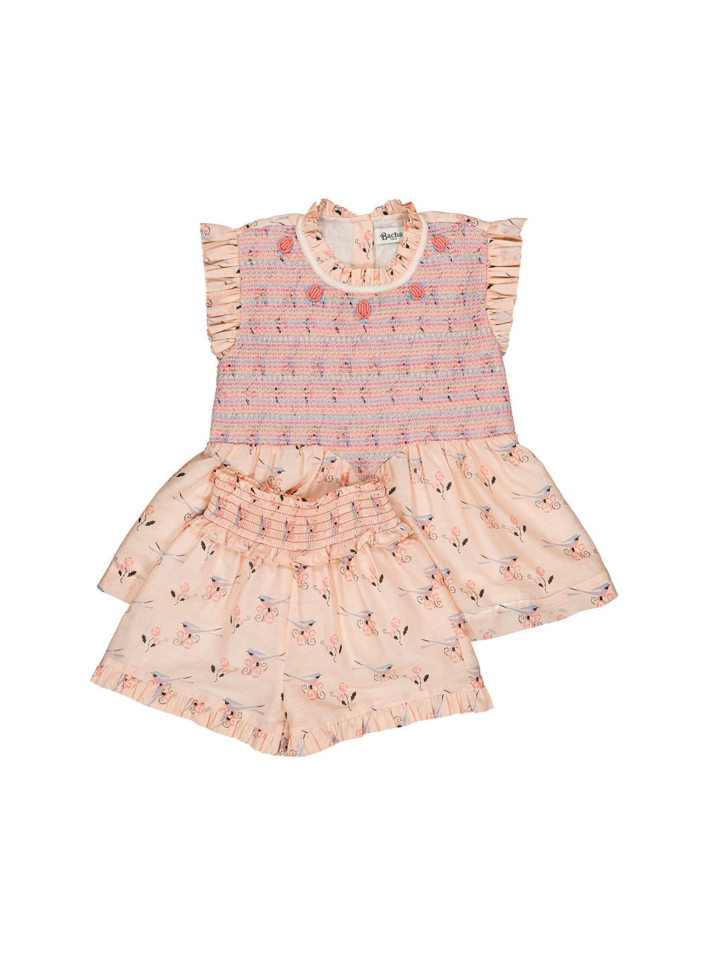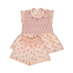 · Coordinating shorts with elasticated smocked waistband and subtle frill hem
