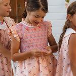 · Hand-smocked sleeveless top with ruffled shoulders and delicate embroidered details
