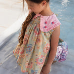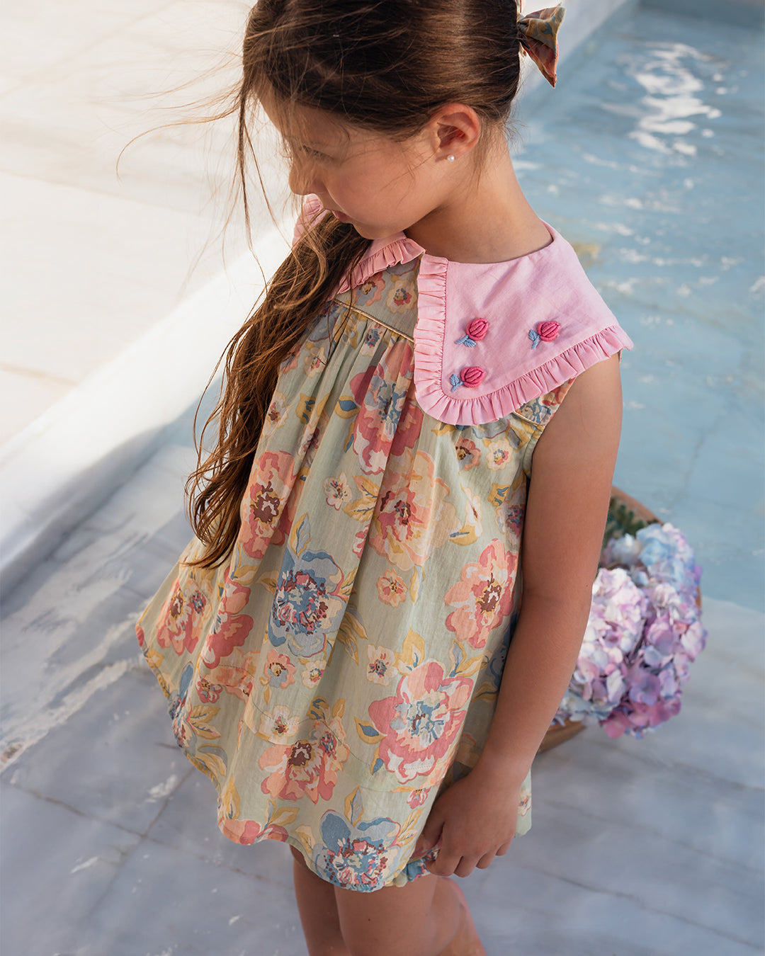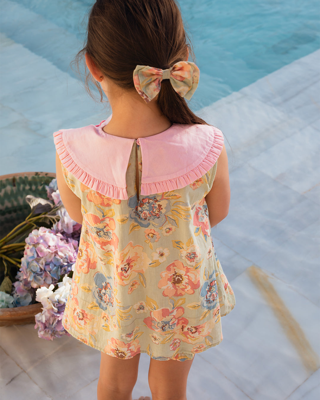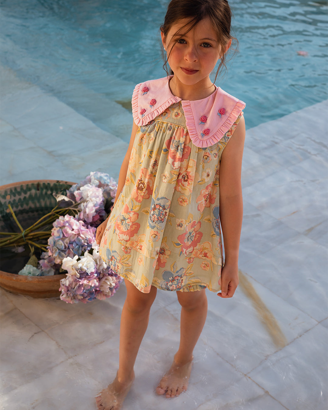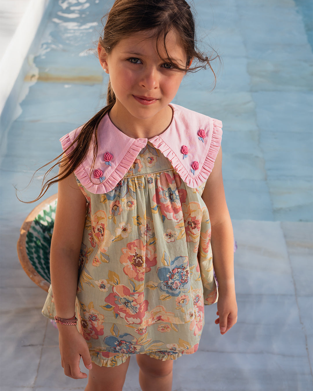 · Sleeveless top with oversized pink embroidered collar and gentle gathers