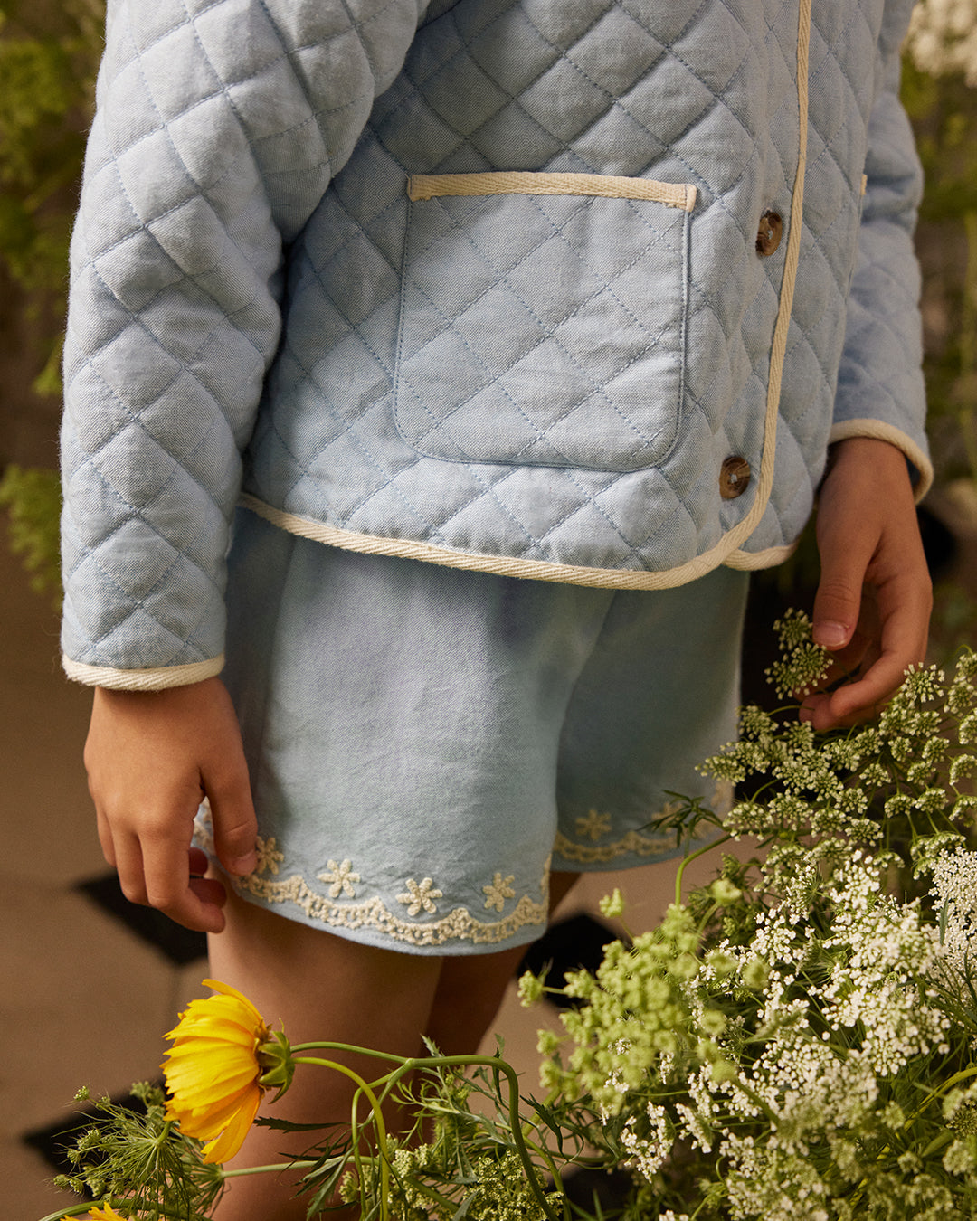 · Front button closure with contrast trim
