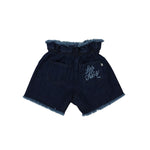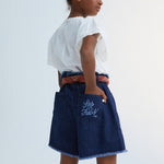 · 5 pockets, elastic waistband at back, flock denim at top and positional prints at front and patch pocket at back.