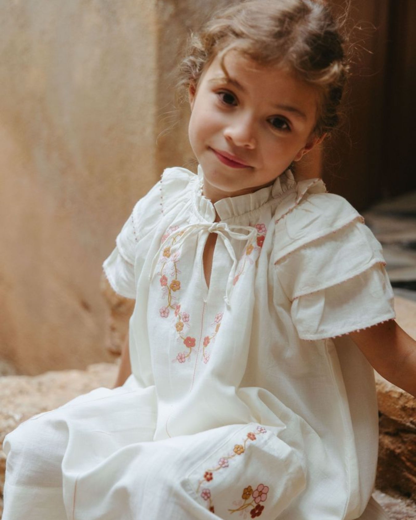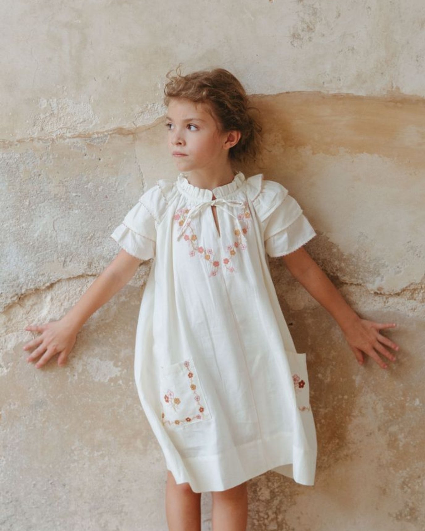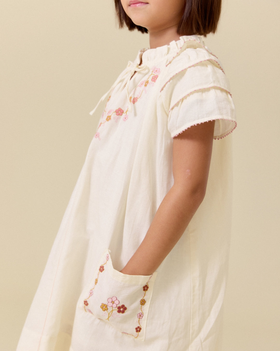 · Soft ivory dress with delicate floral embroidery along the neckline