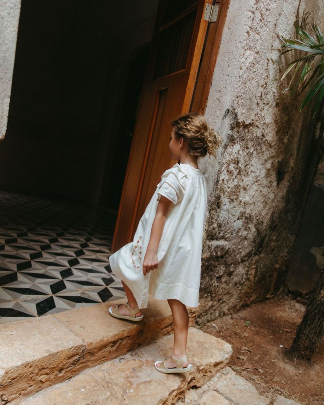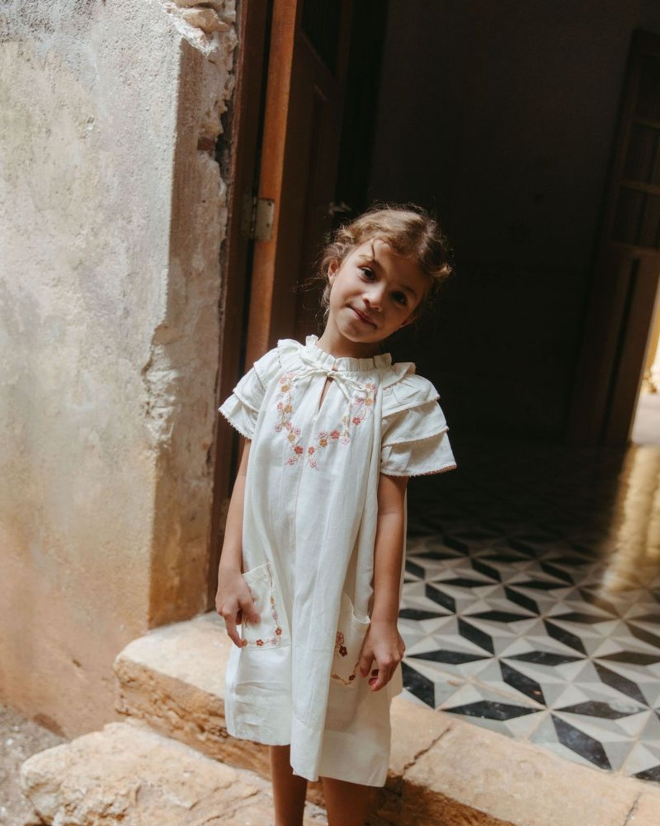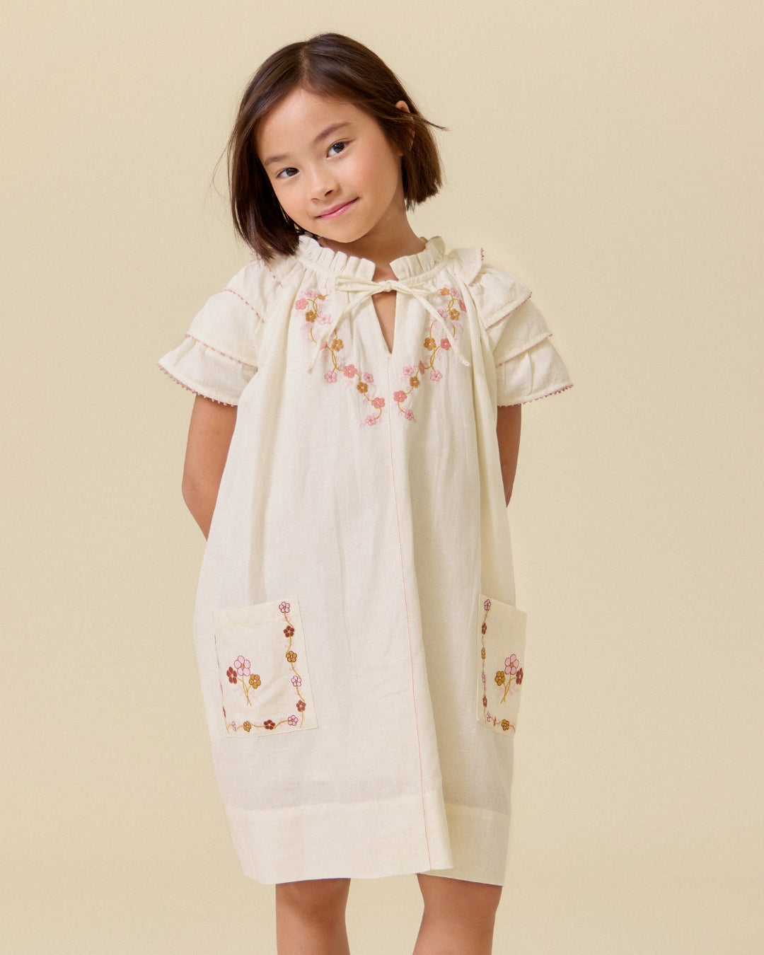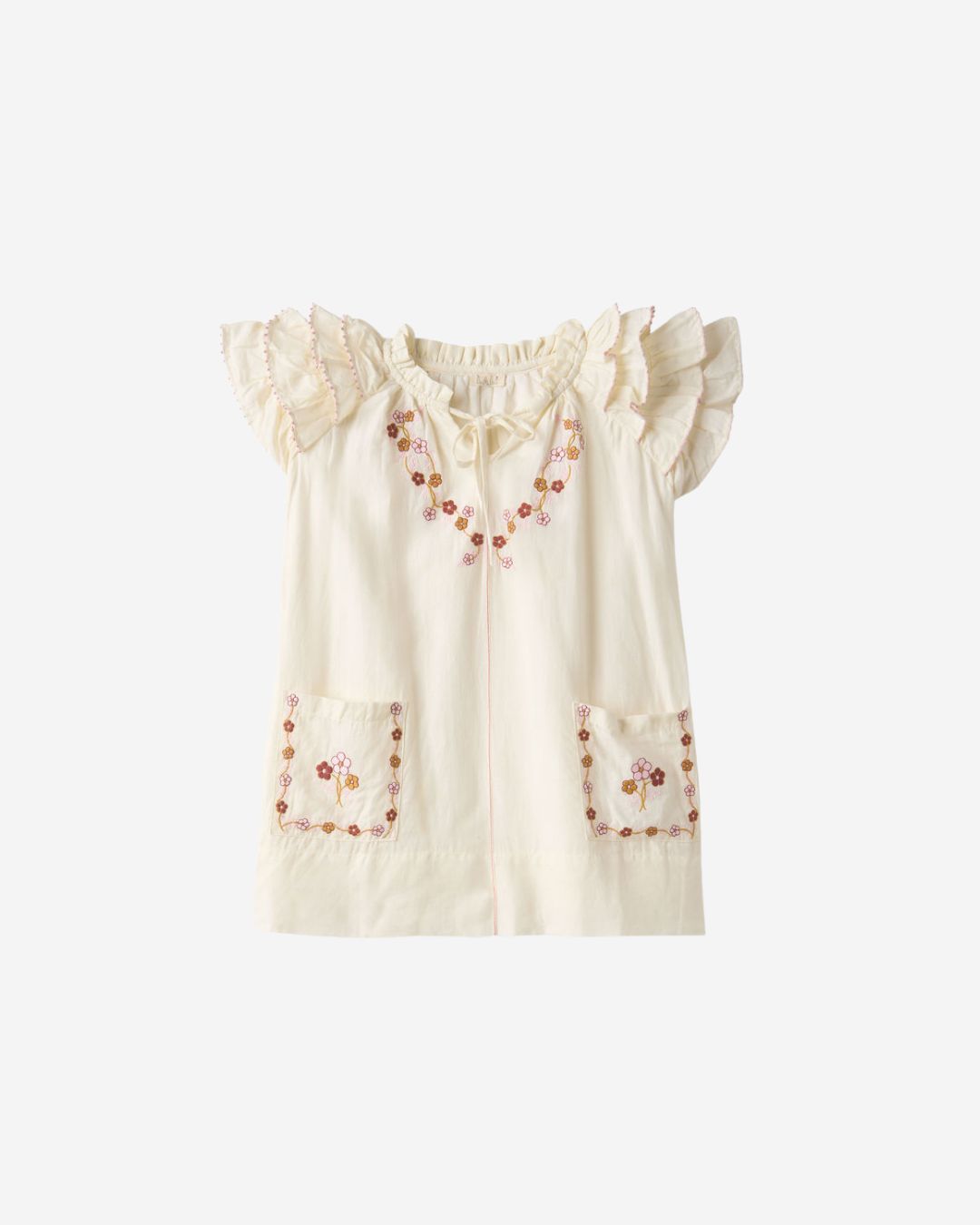 · Soft ivory dress with delicate floral embroidery along the neckline