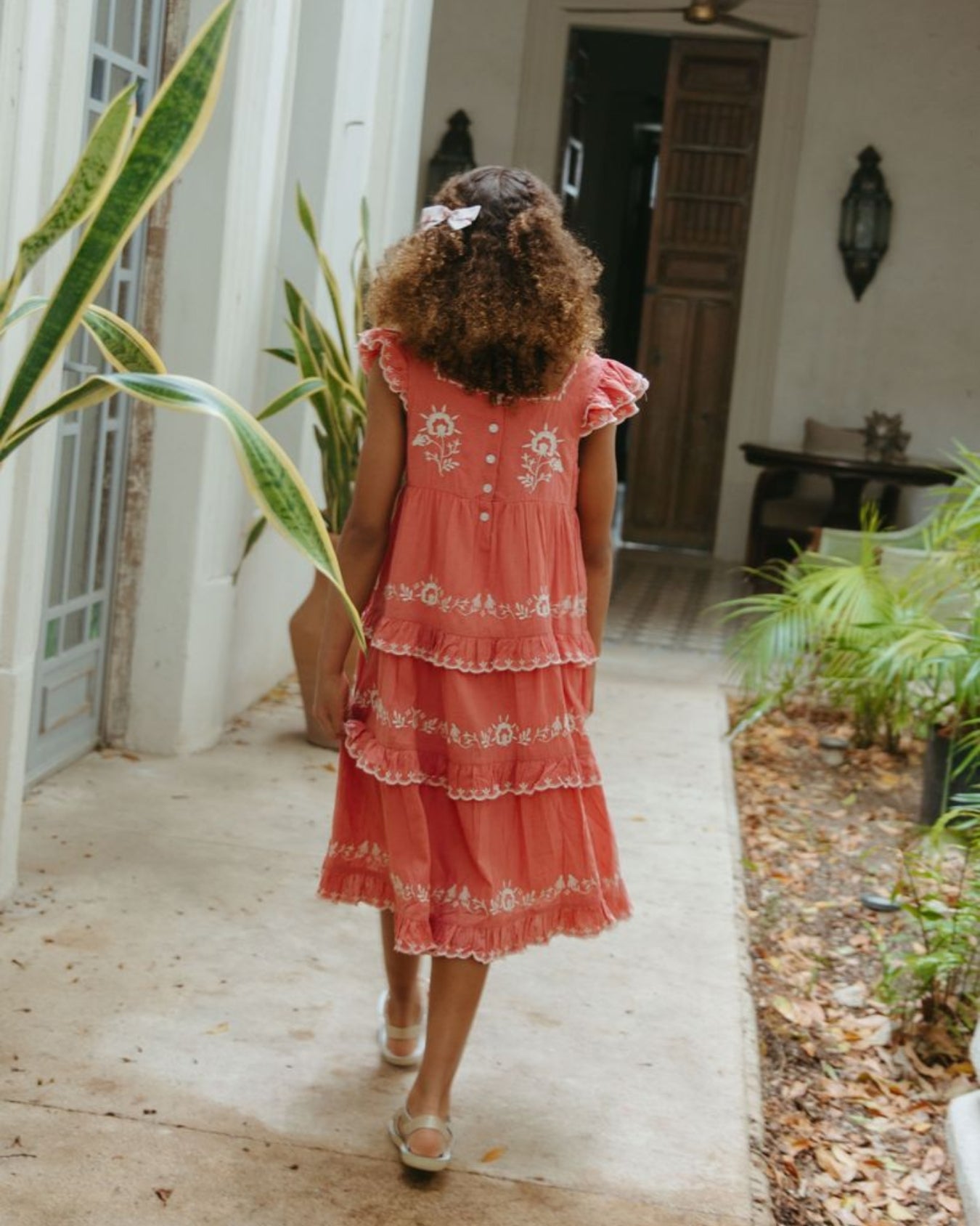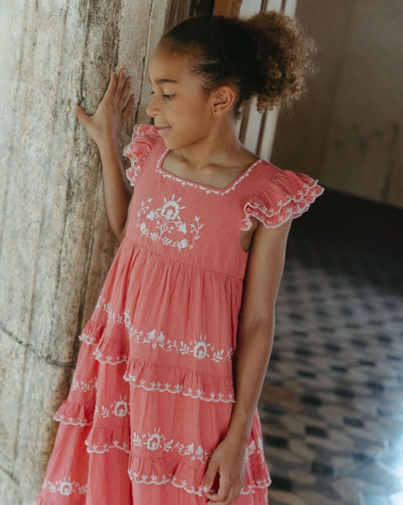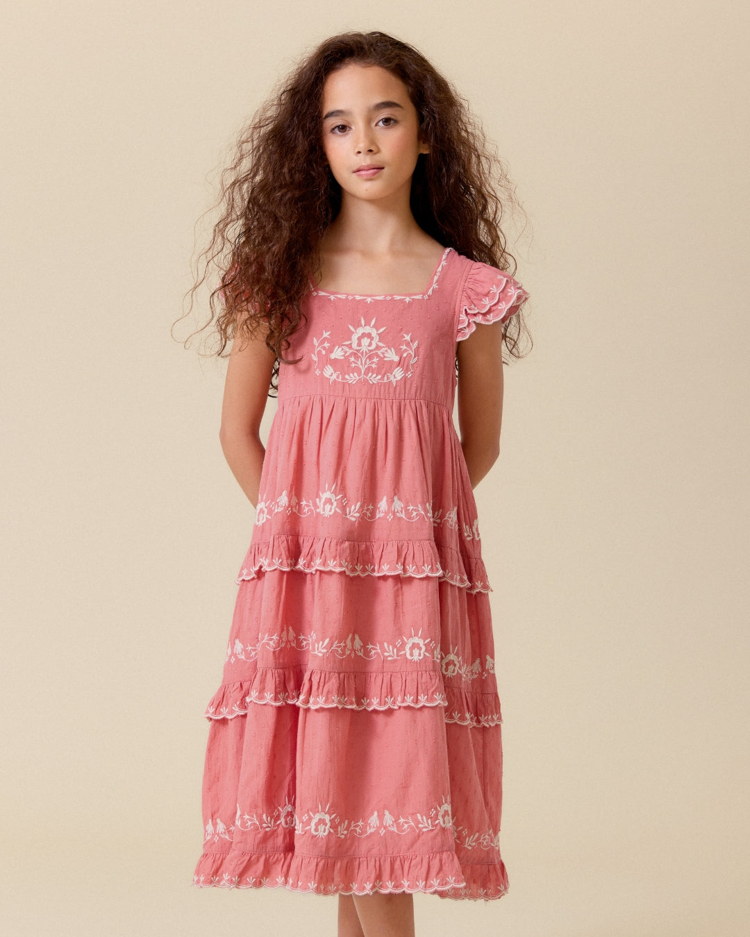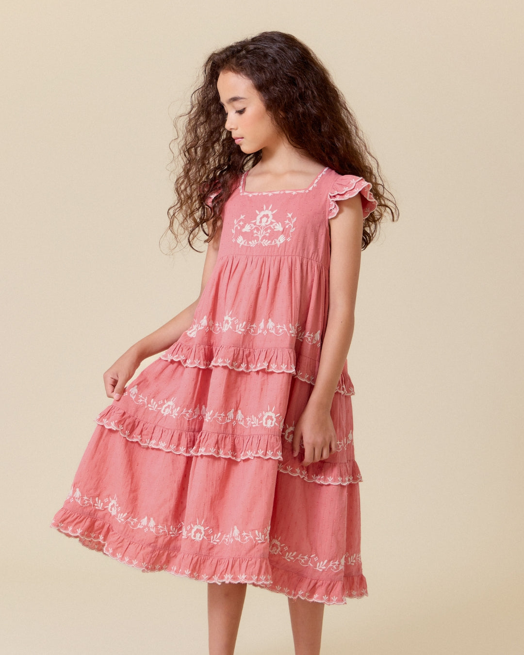 · Romantic tiered dress in a warm rose pink hue