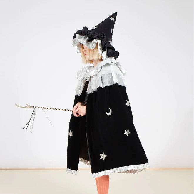 This witch's hat, with ruffle details, is very stylish indeed. It is crafted from black velvet, with silver lamé and silver glitter stars and moons. An essential accessory for Halloween, or to add to a dressing up box for imaginative play any time of the year.