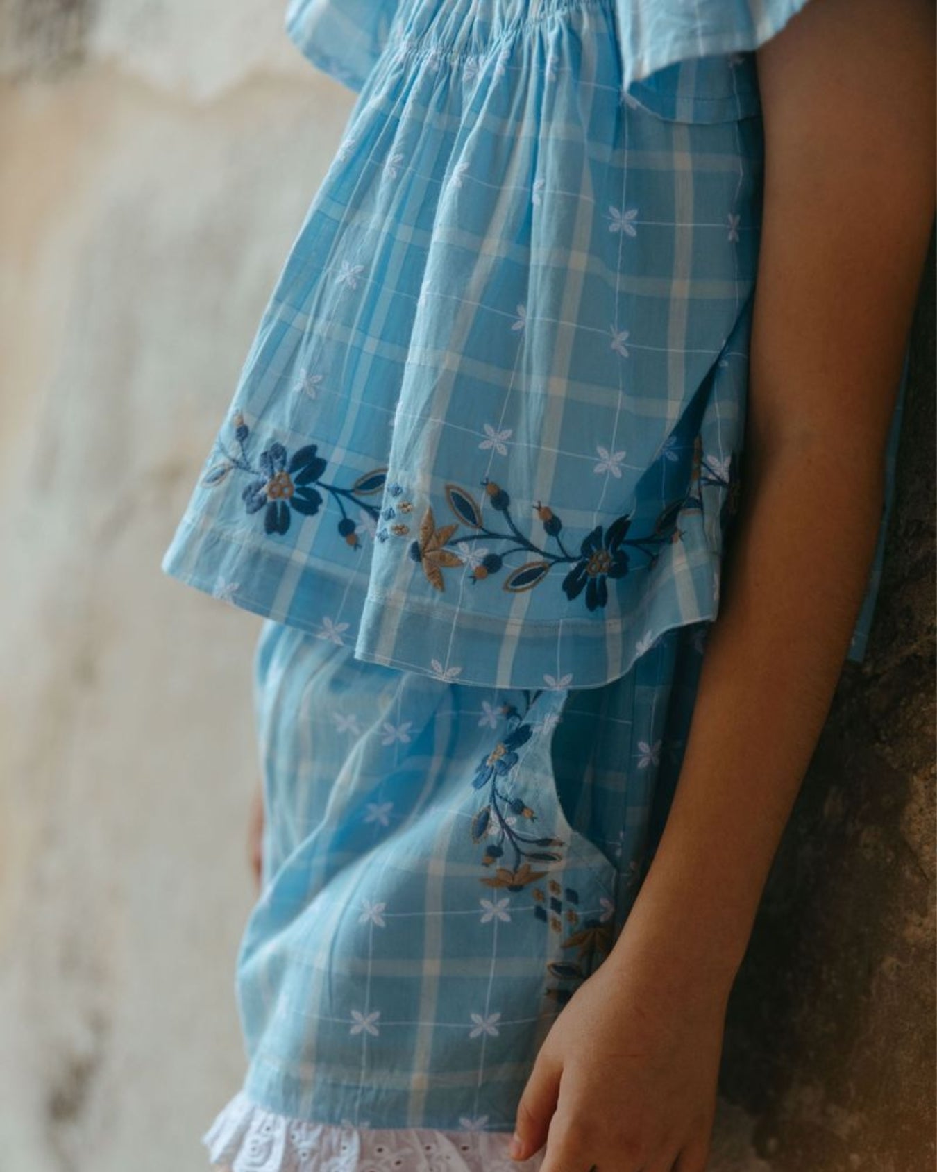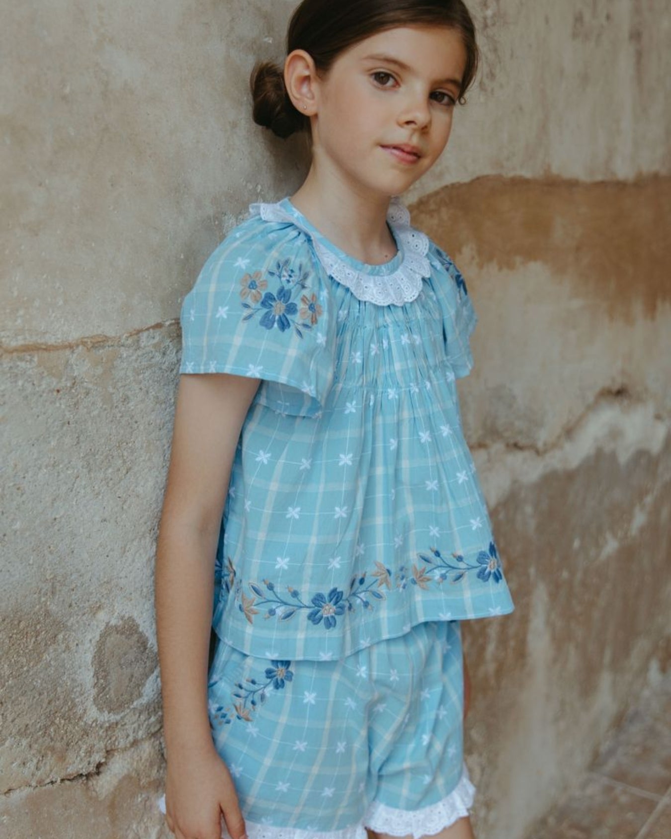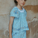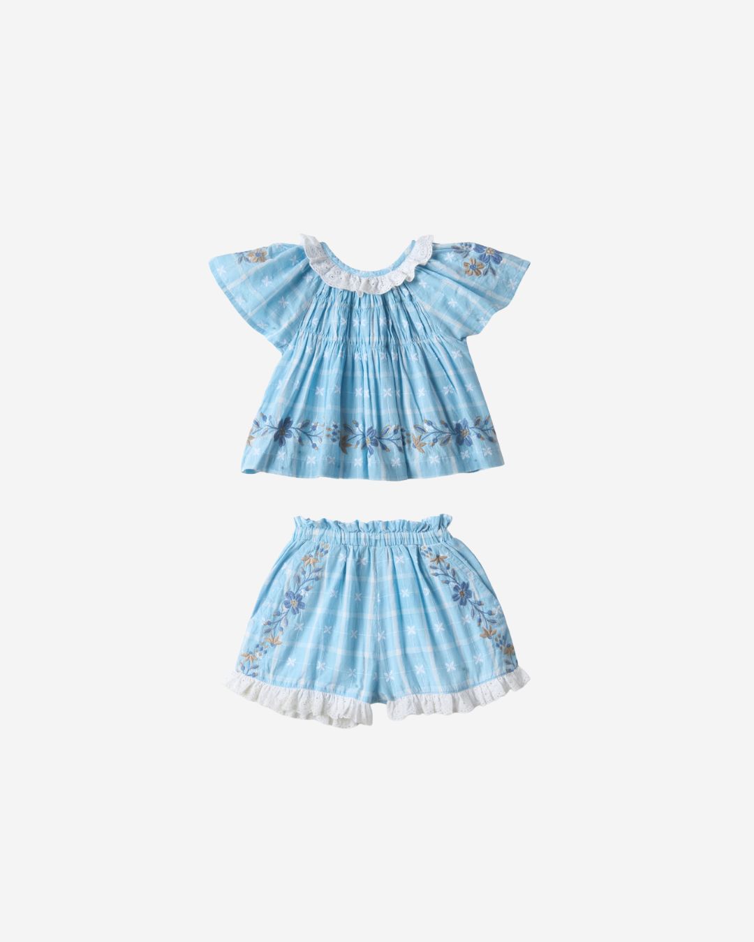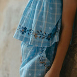 · Soft vintage blue plaid set with delicate floral detailing