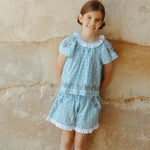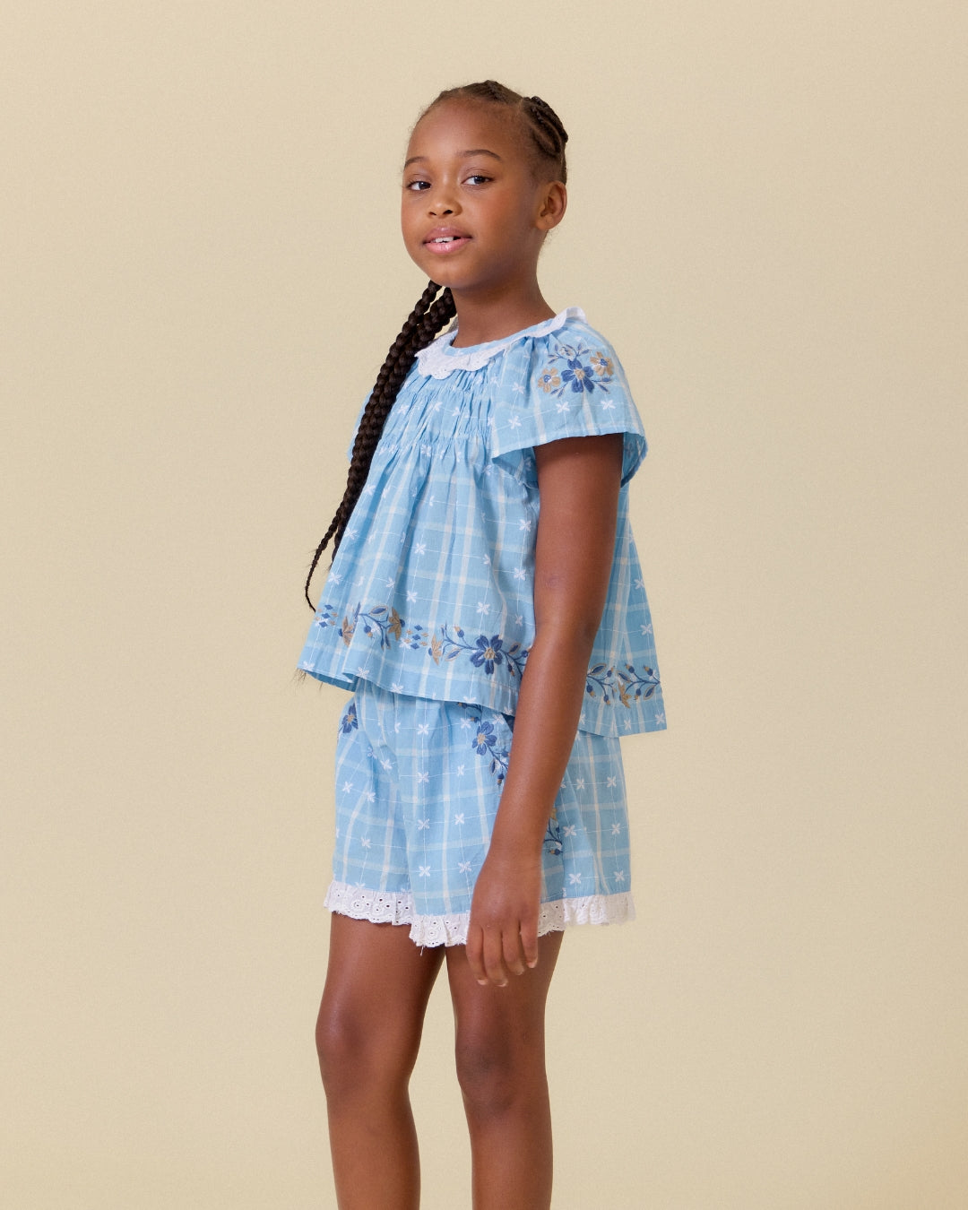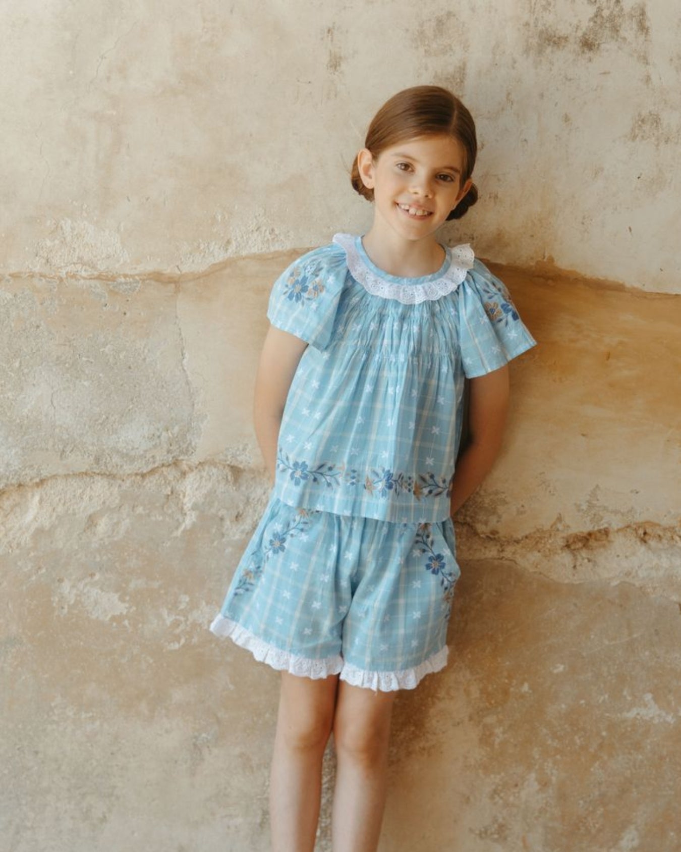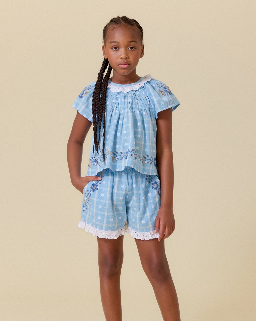 · Soft vintage blue plaid set with delicate floral detailing
