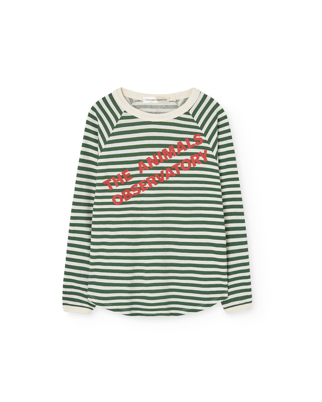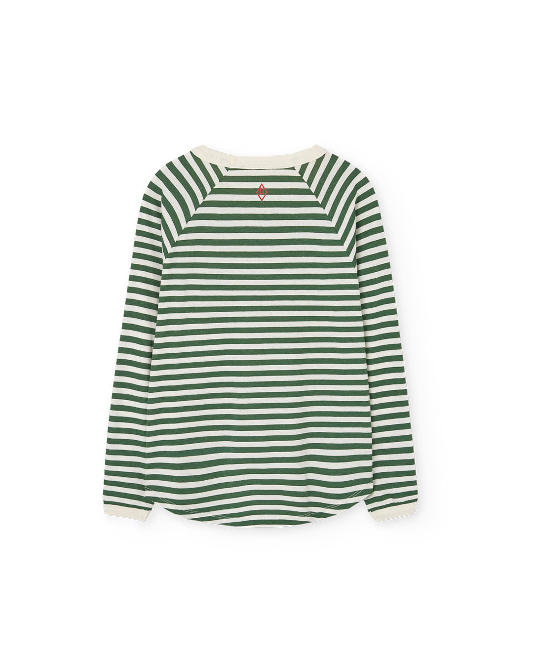 • 부드러운 면 소재의 긴팔 티셔츠로, 녹색과 흰색 줄무늬 패턴이 있습니다.