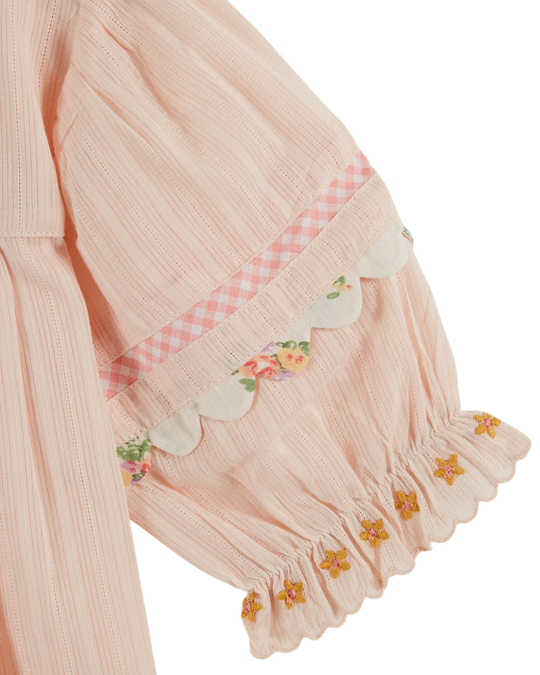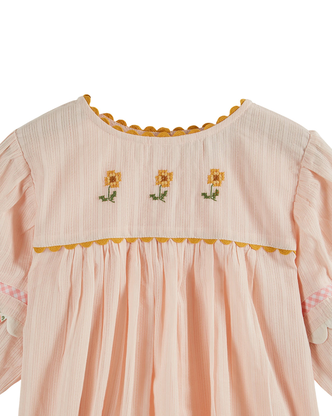 • 물결 모양 테두리와 대비되는 색상의 트림이 있는 퍼프 소매