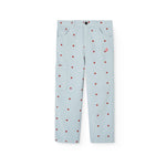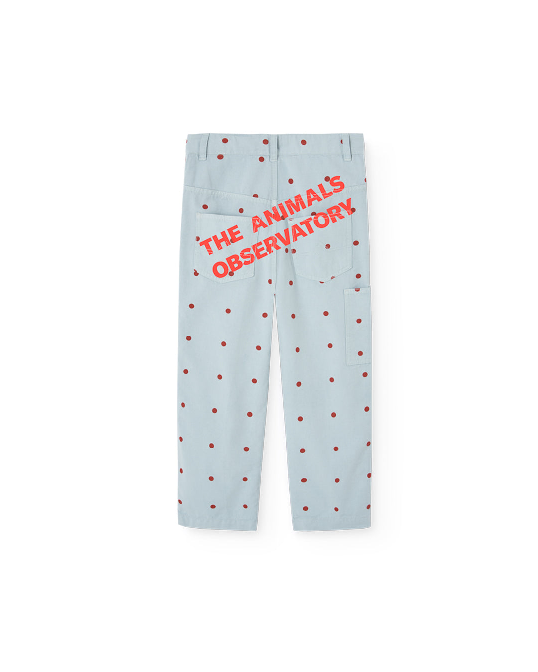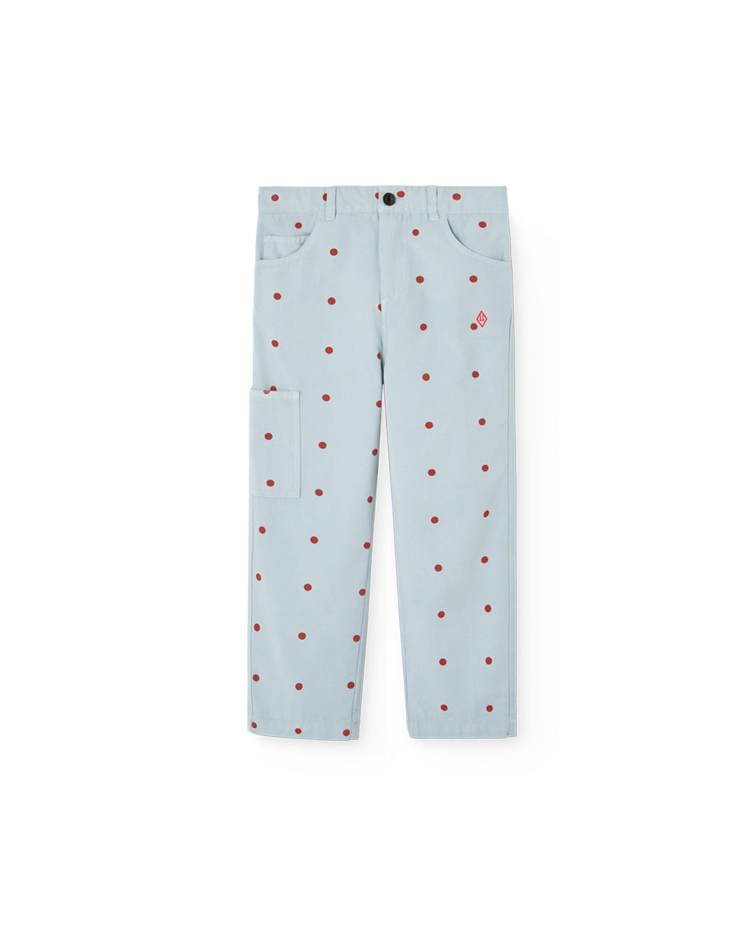 • 부드러운 하늘색 바탕에 빨간색 물방울 무늬가 있는 가벼운 면 바지