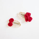 · 핸드메이드 코바늘 헤어핀 아이보리색 면 소재에 빨간색 리본 장식 • 안전한 스냅 클립 뒷면 · 일상적인 룩에 달콤한 포인트를 더하세요
