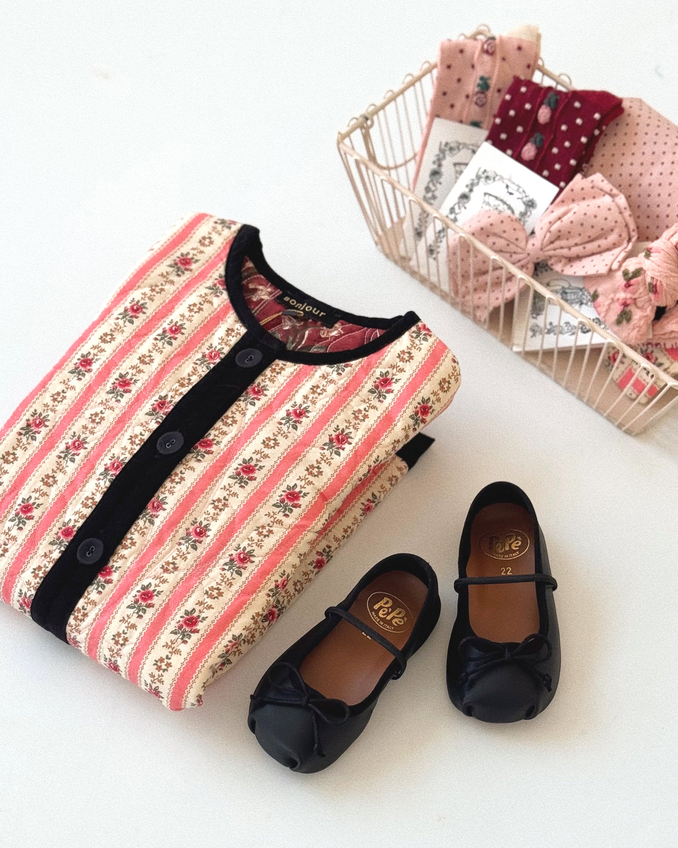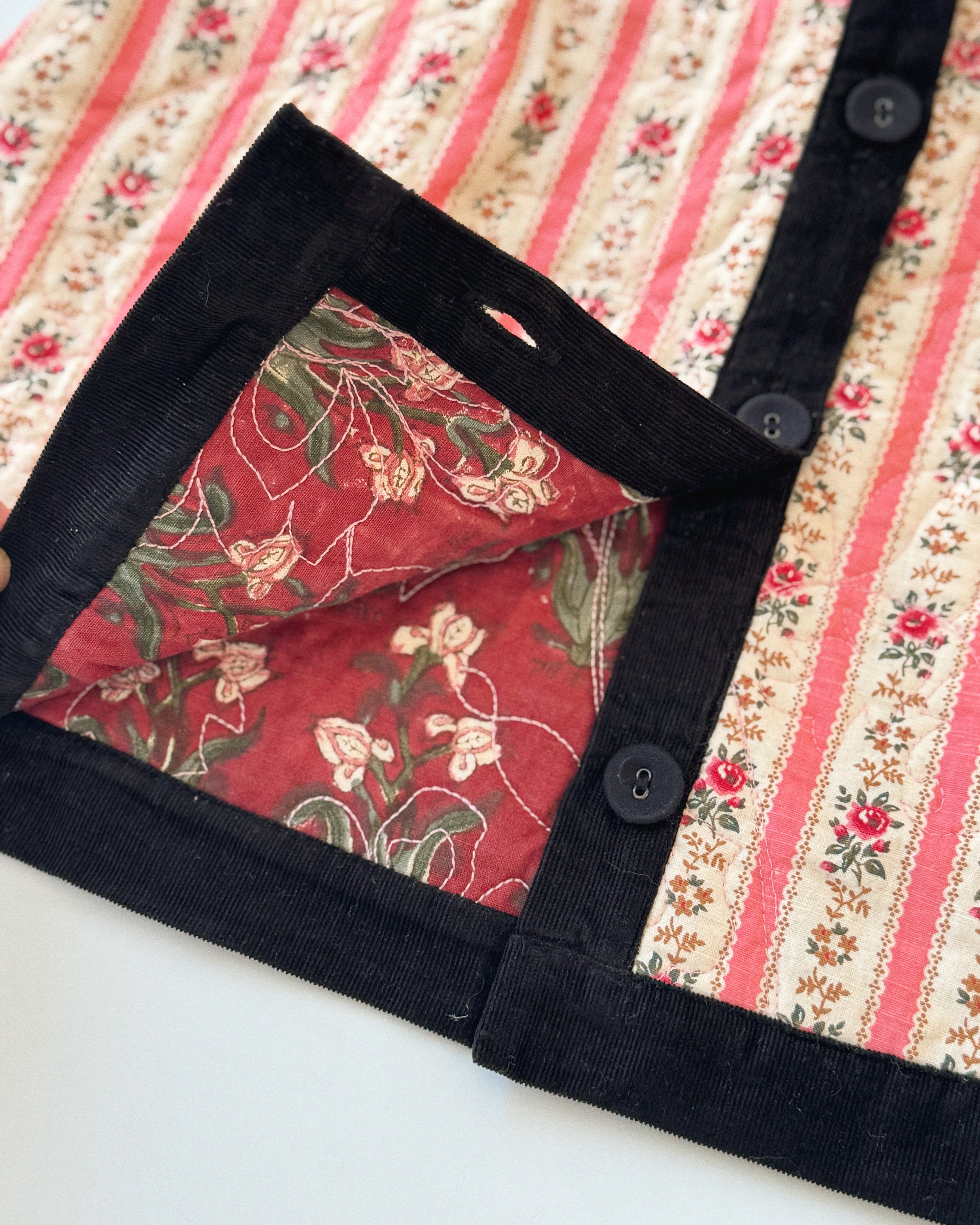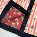· Features tapestry pink stripe print with velvet trims