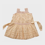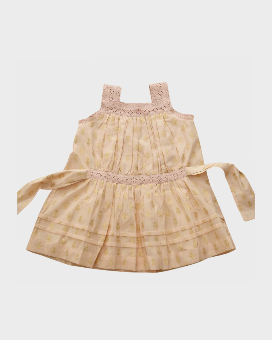· 스시 핑크 누드 부직포에 골드 자카드 꽃 · 사이즈 네크라인에 자수 영국 레이스 리본 · 전체 안감 처리 · 뒤쪽에 묶은 벨트 · 30도에서 세탁 권장