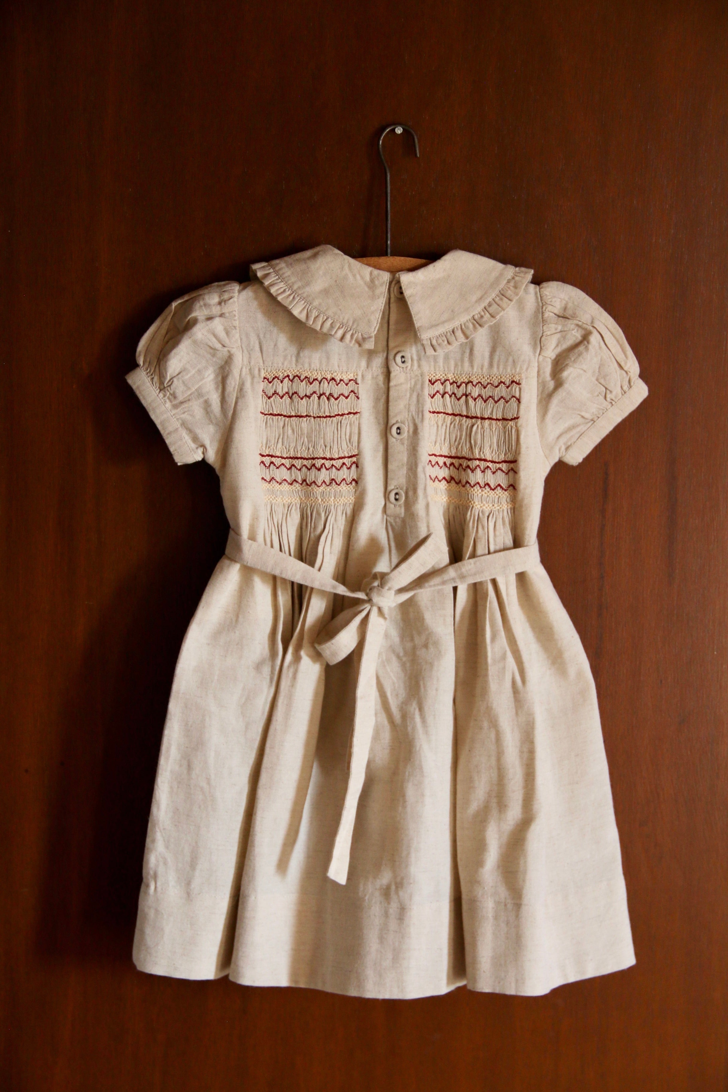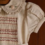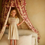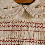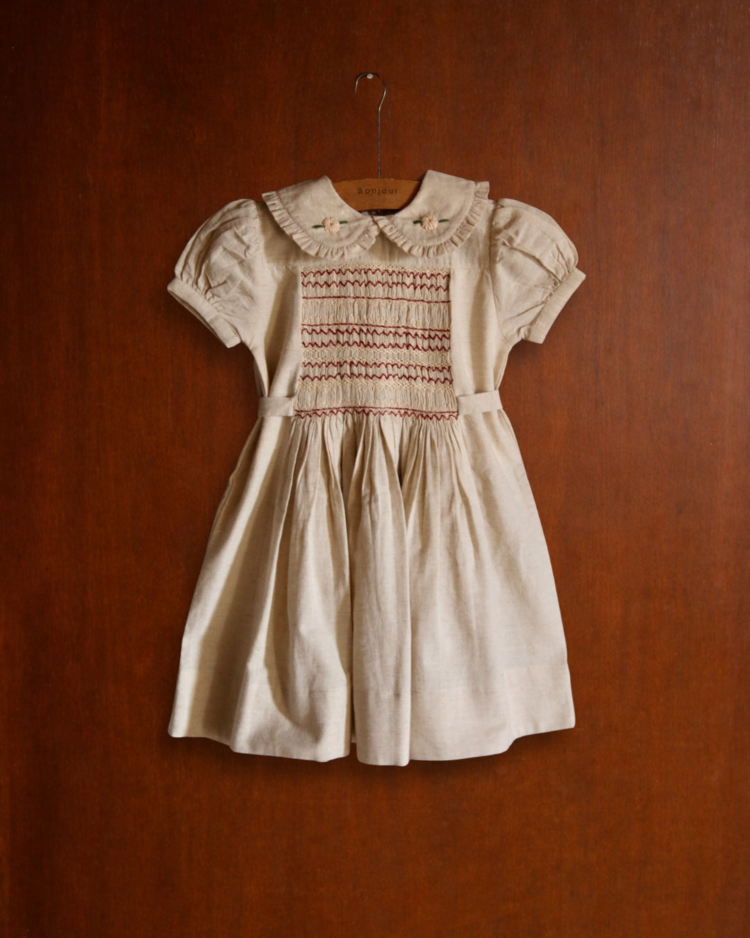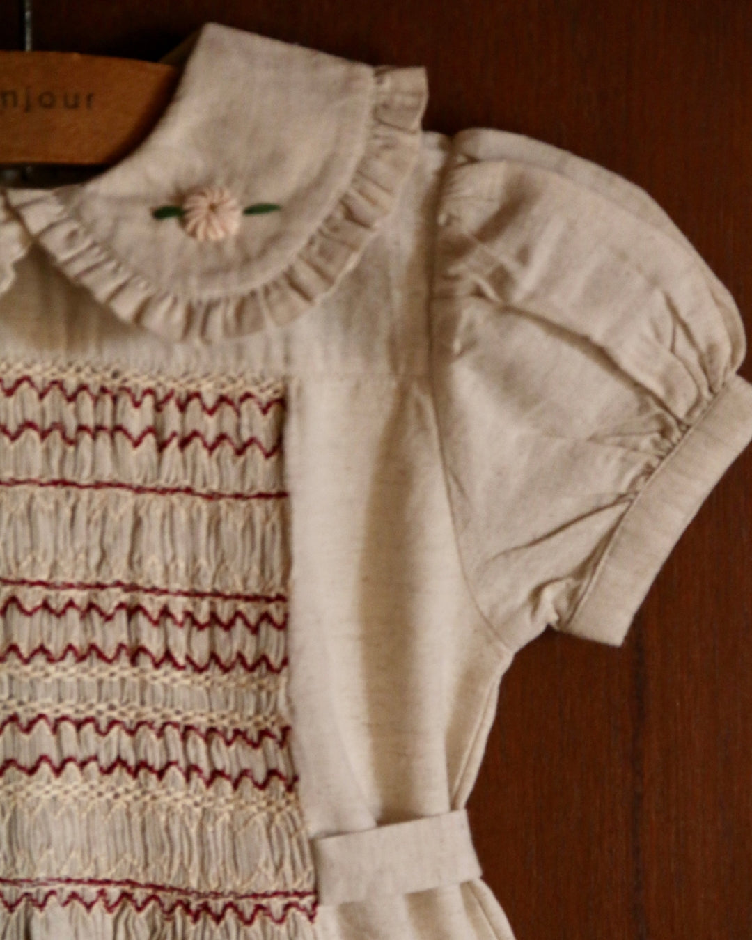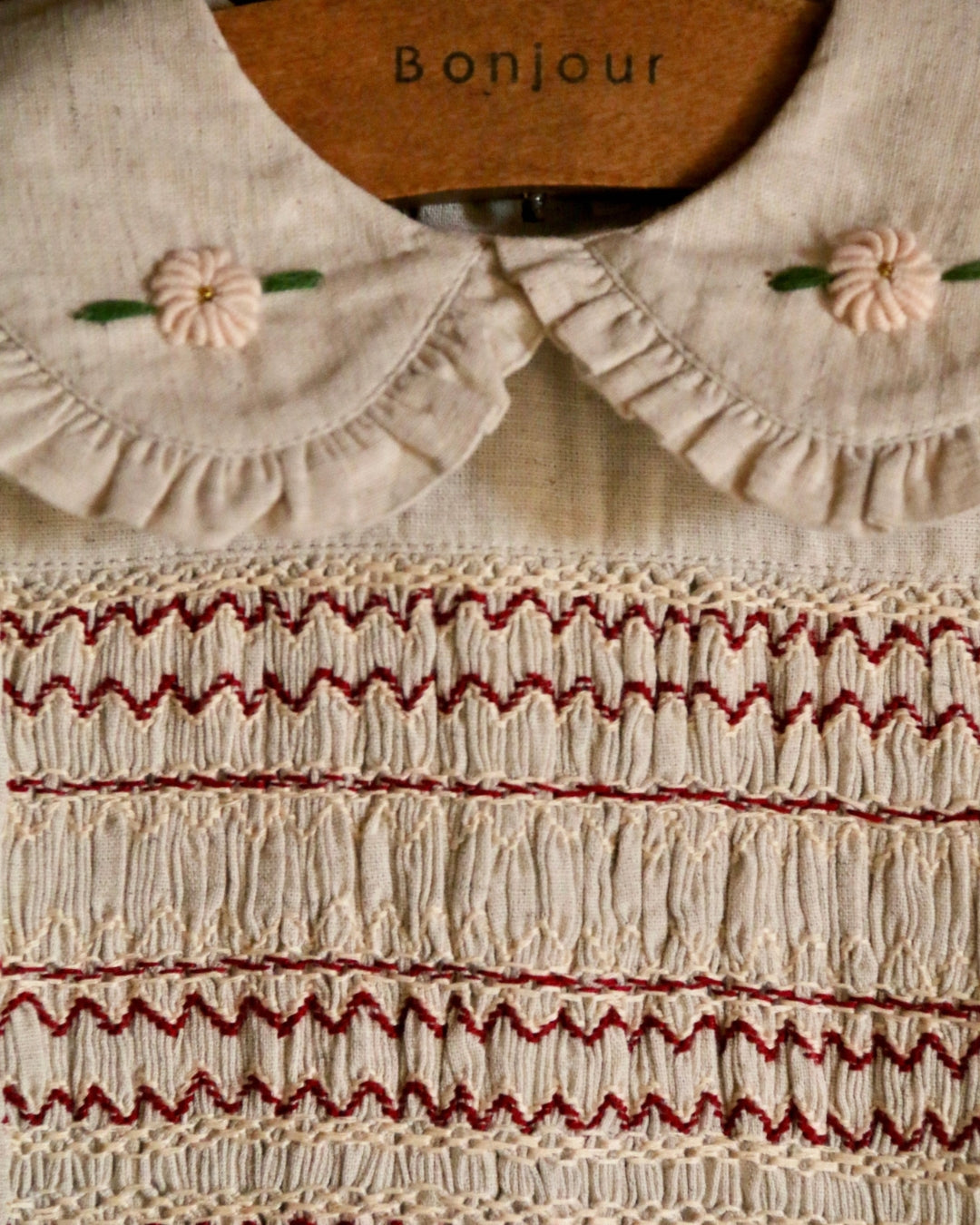 · A natural cotton dress featuring delicate hand-smocking with contrast stitching across the bodice
