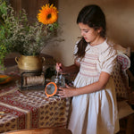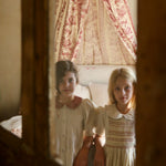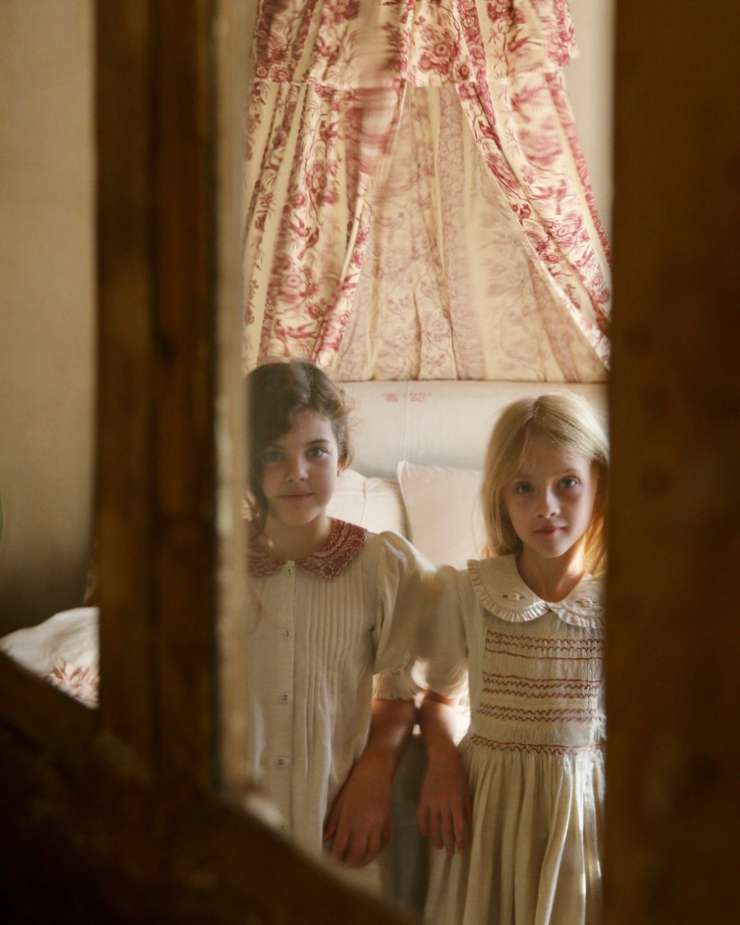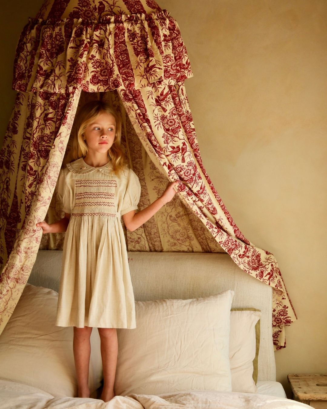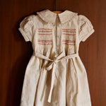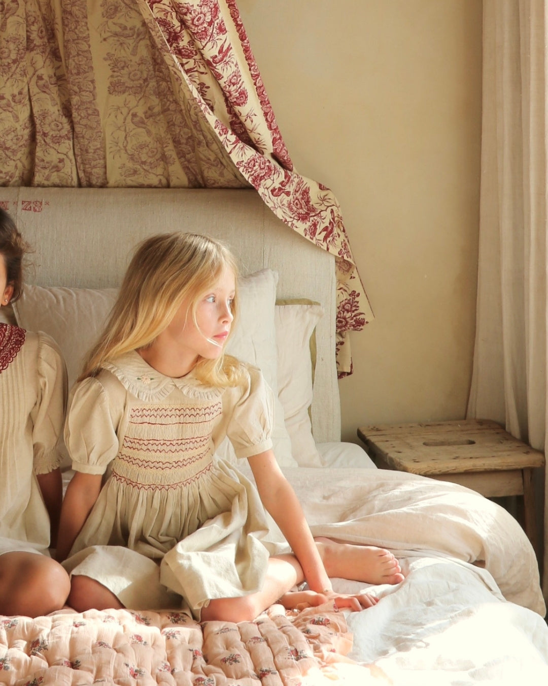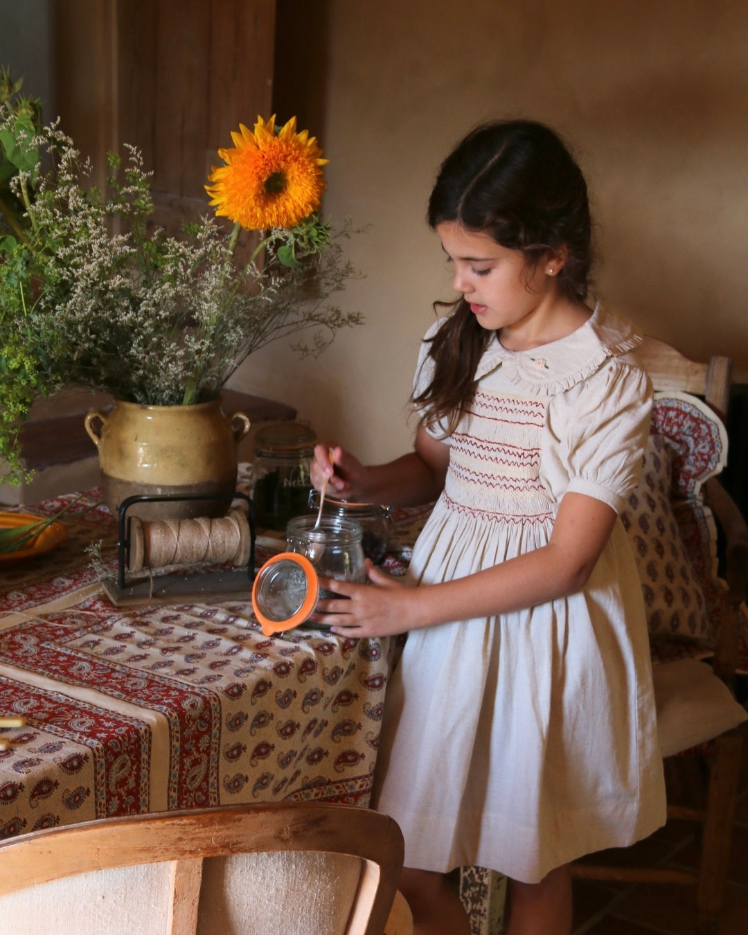 · A natural cotton dress featuring delicate hand-smocking with contrast stitching across the bodice