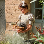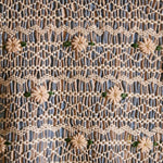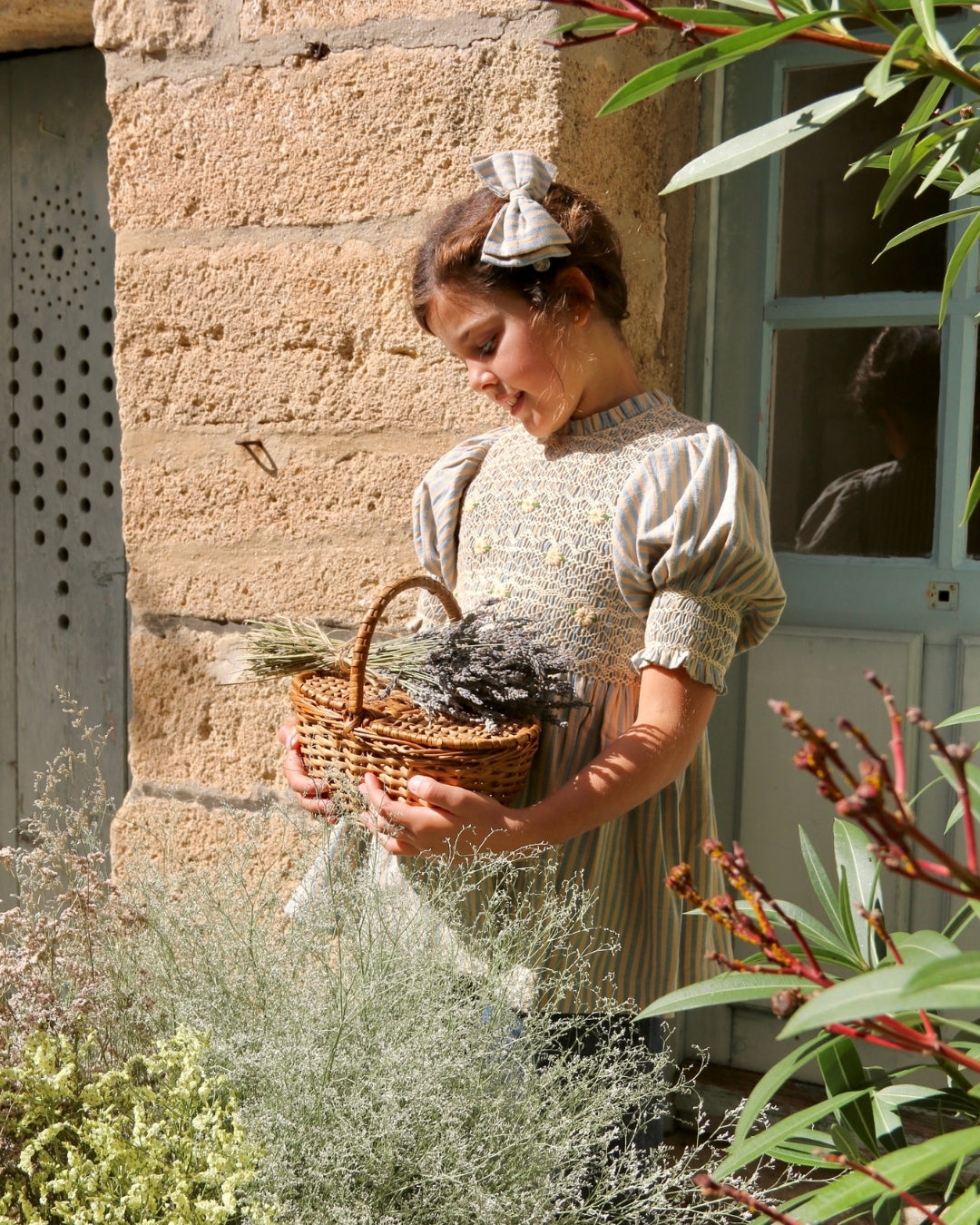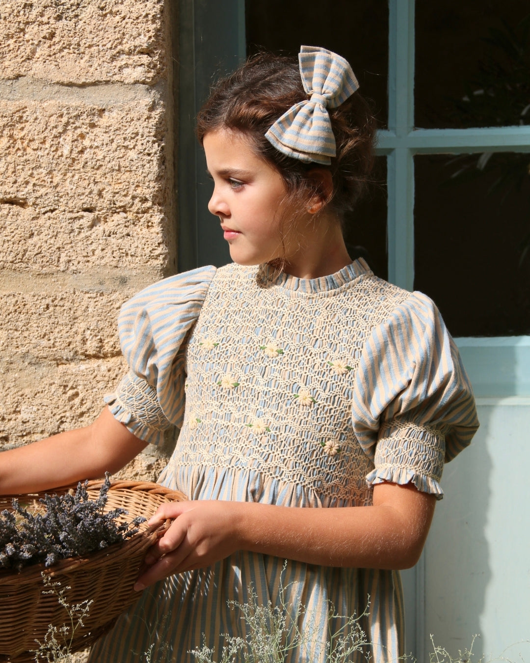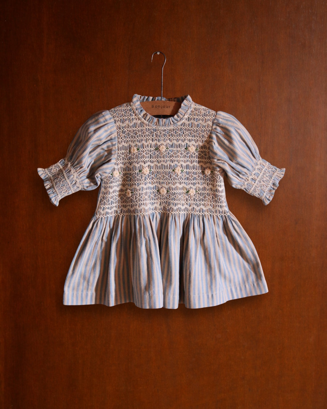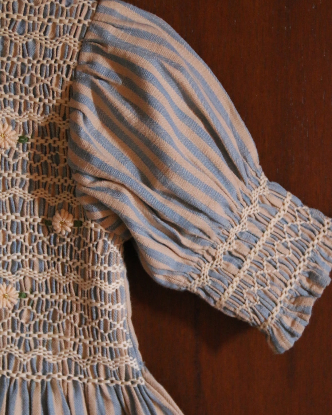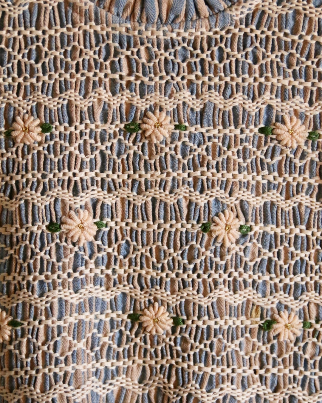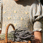 · A delicate smocked blouse with intricate hand embroidery across the bodice