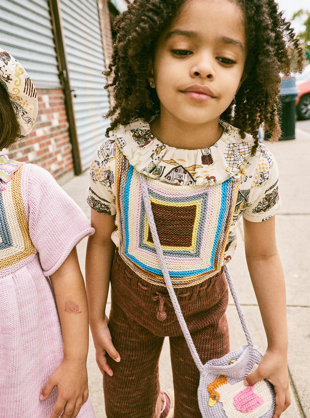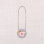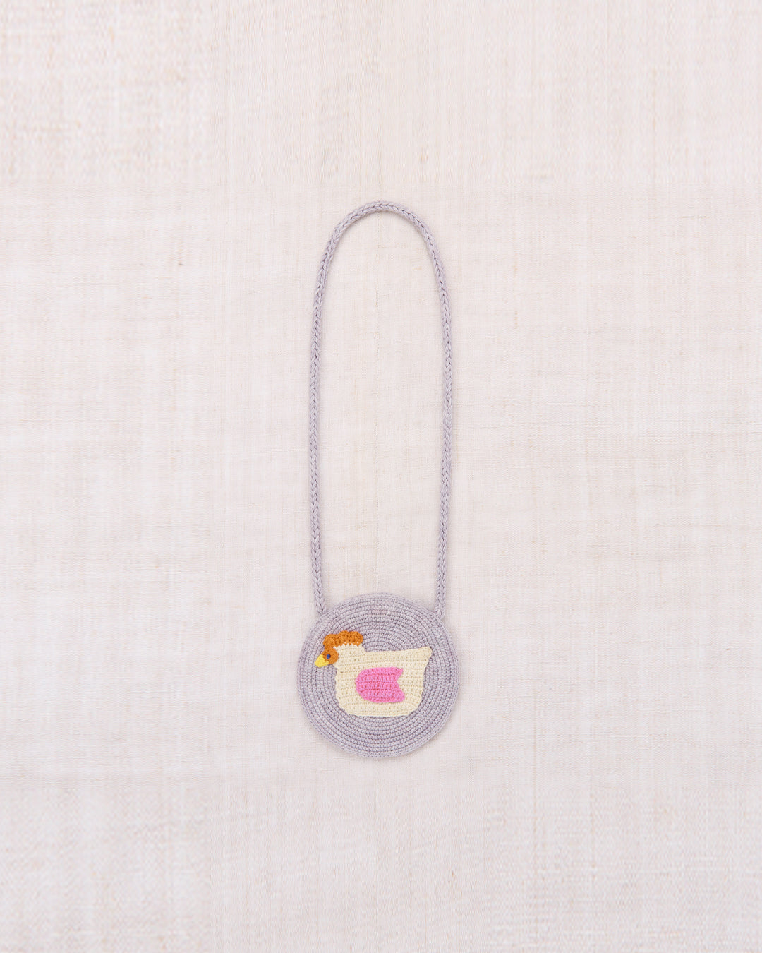 · Hand-crocheted circle bag in a soft mist tone with a charming hen motif