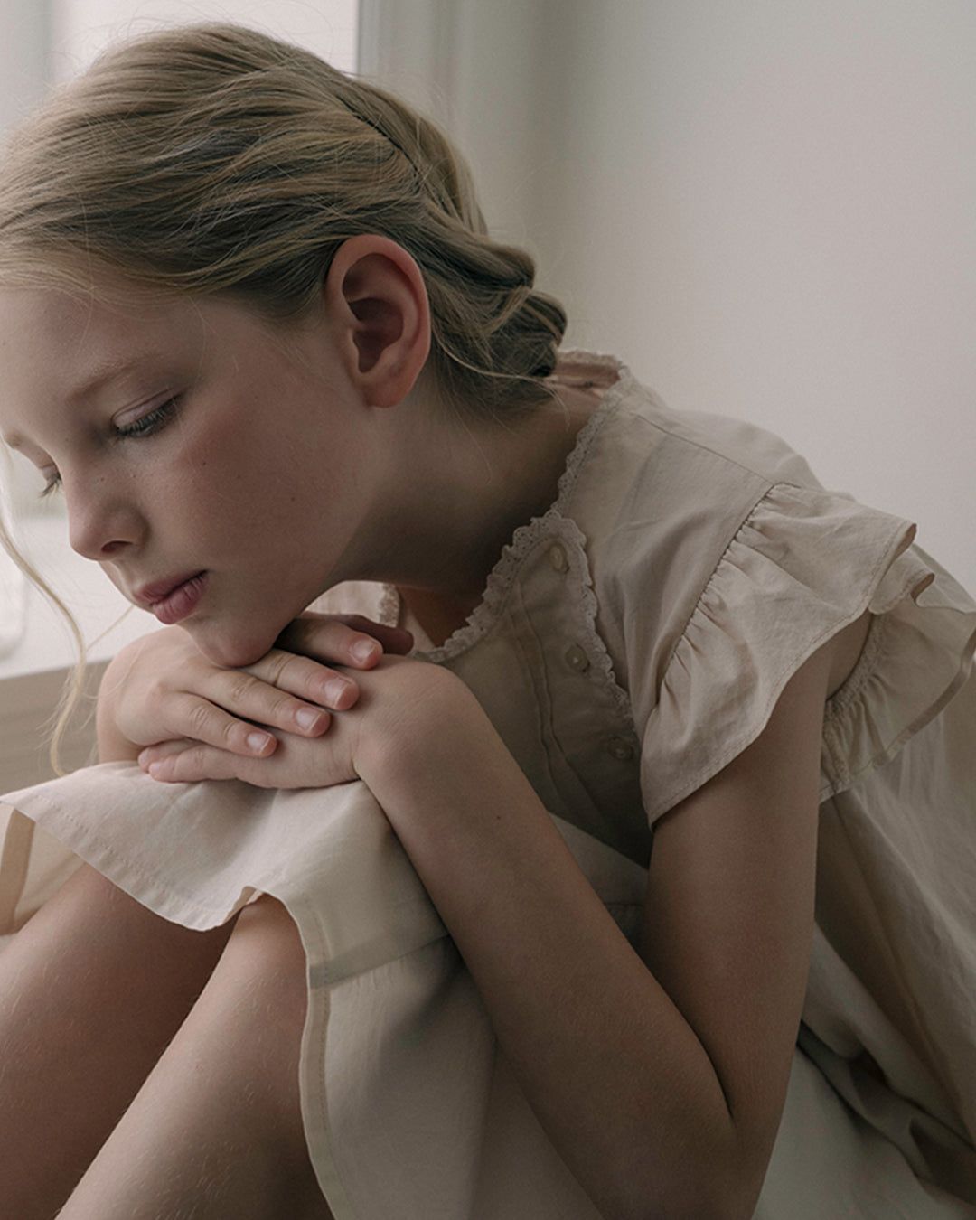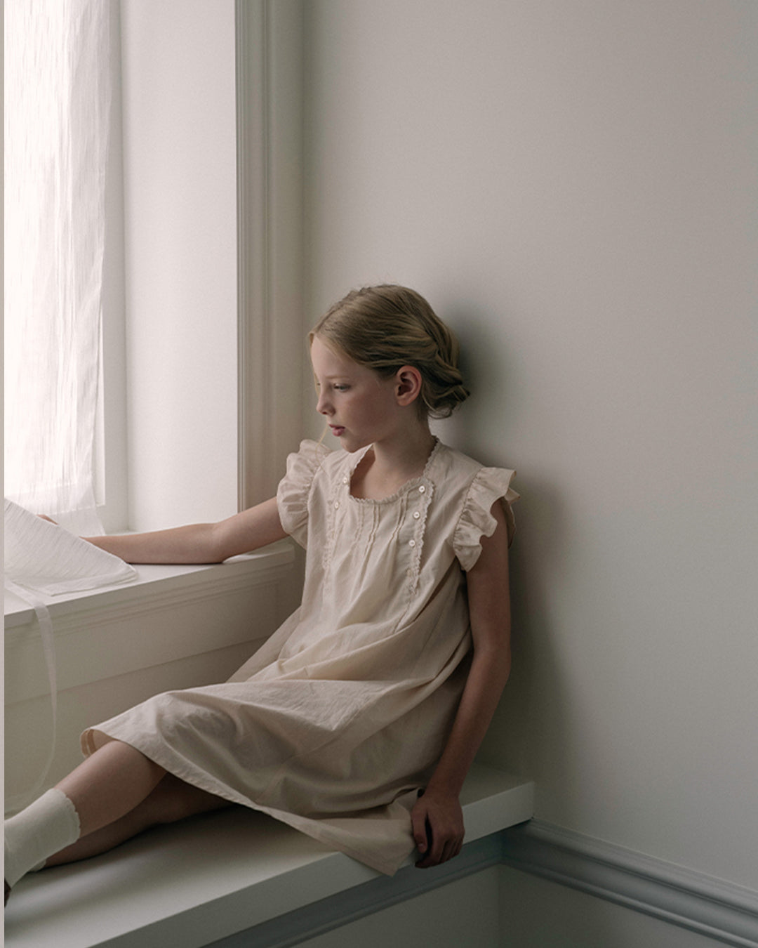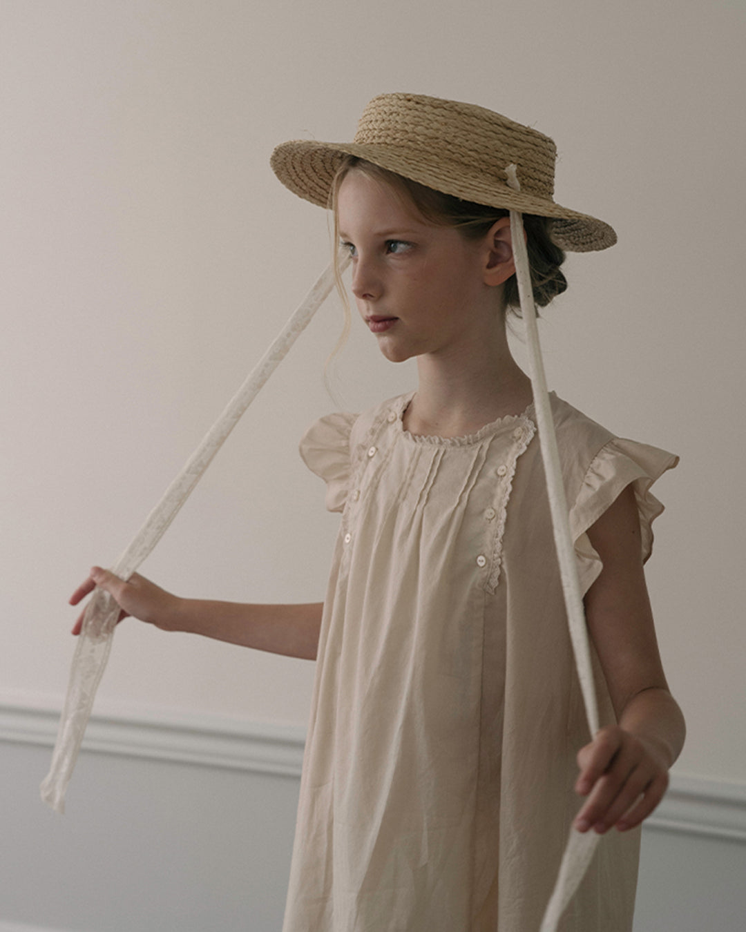 · Soft beige dress with flutter sleeves