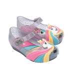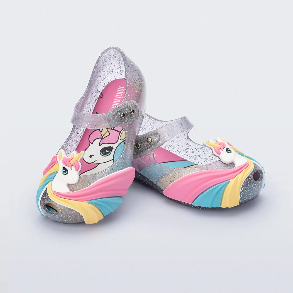 미니 멜리사 울트라걸은 독특한 스트라이프 유니콘 아플리케로 마법 같은 매력을 더합니다. 반짝이는 장식과 컬러풀한 깔창이 매력을 더하고, 아주 작은 피프토가 귀여움을 더합니다.