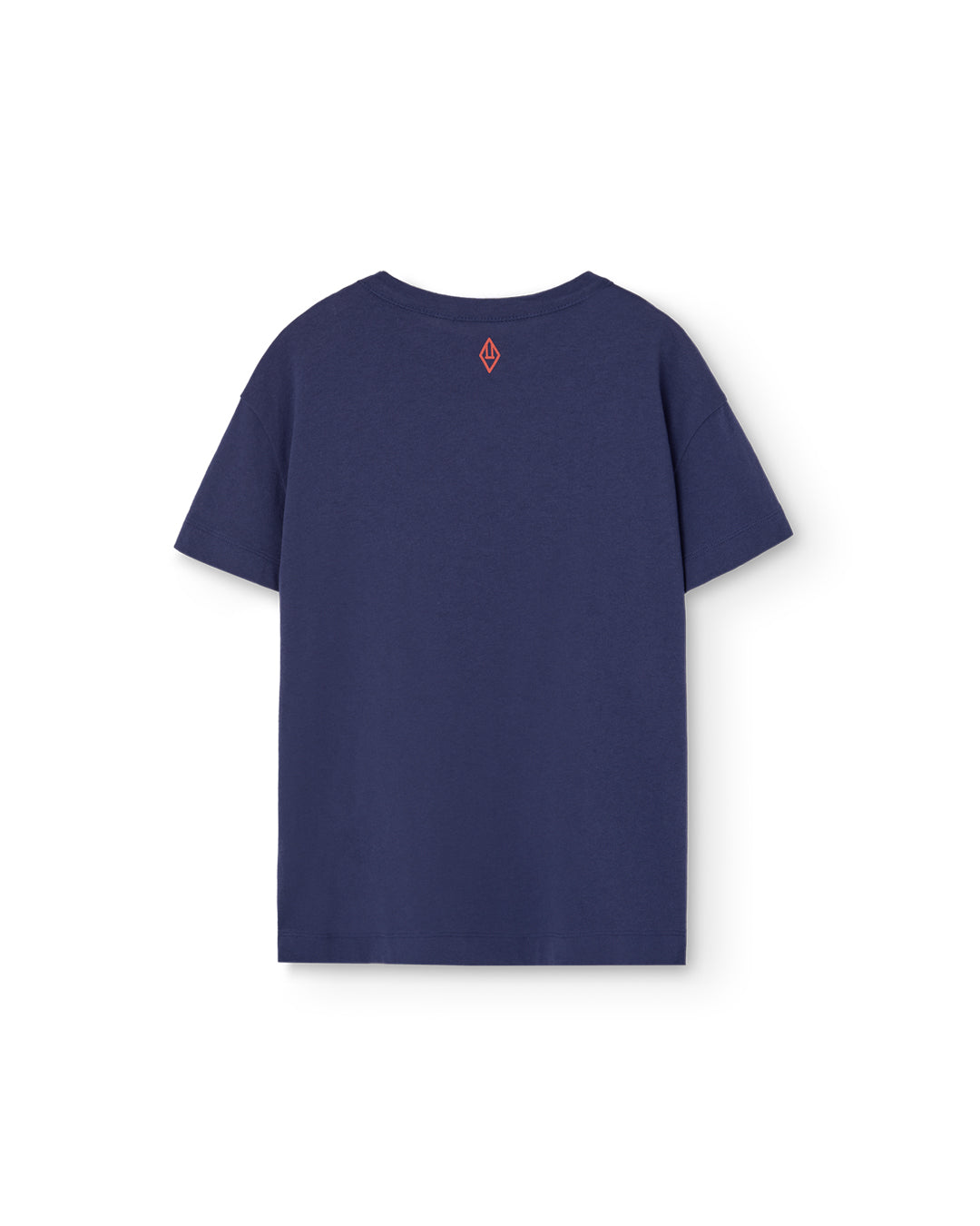 • 부드러운 면 저지 티셔츠로, 짙은 파란색 바탕에 동물 관측소 로고가 선명하게 프린트되어 있습니다.