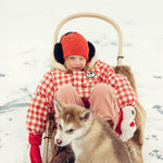 • 빨간색과 흰색 체크무늬의 두툼한 패딩 재킷으로, 부드러운 인조 양털 후드가 달려 있습니다.