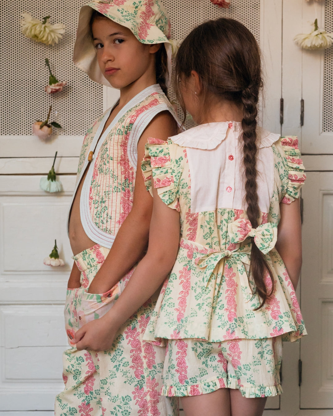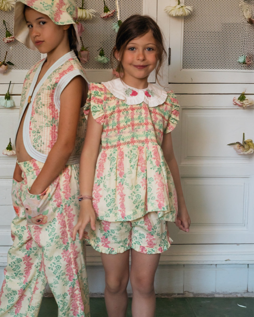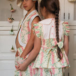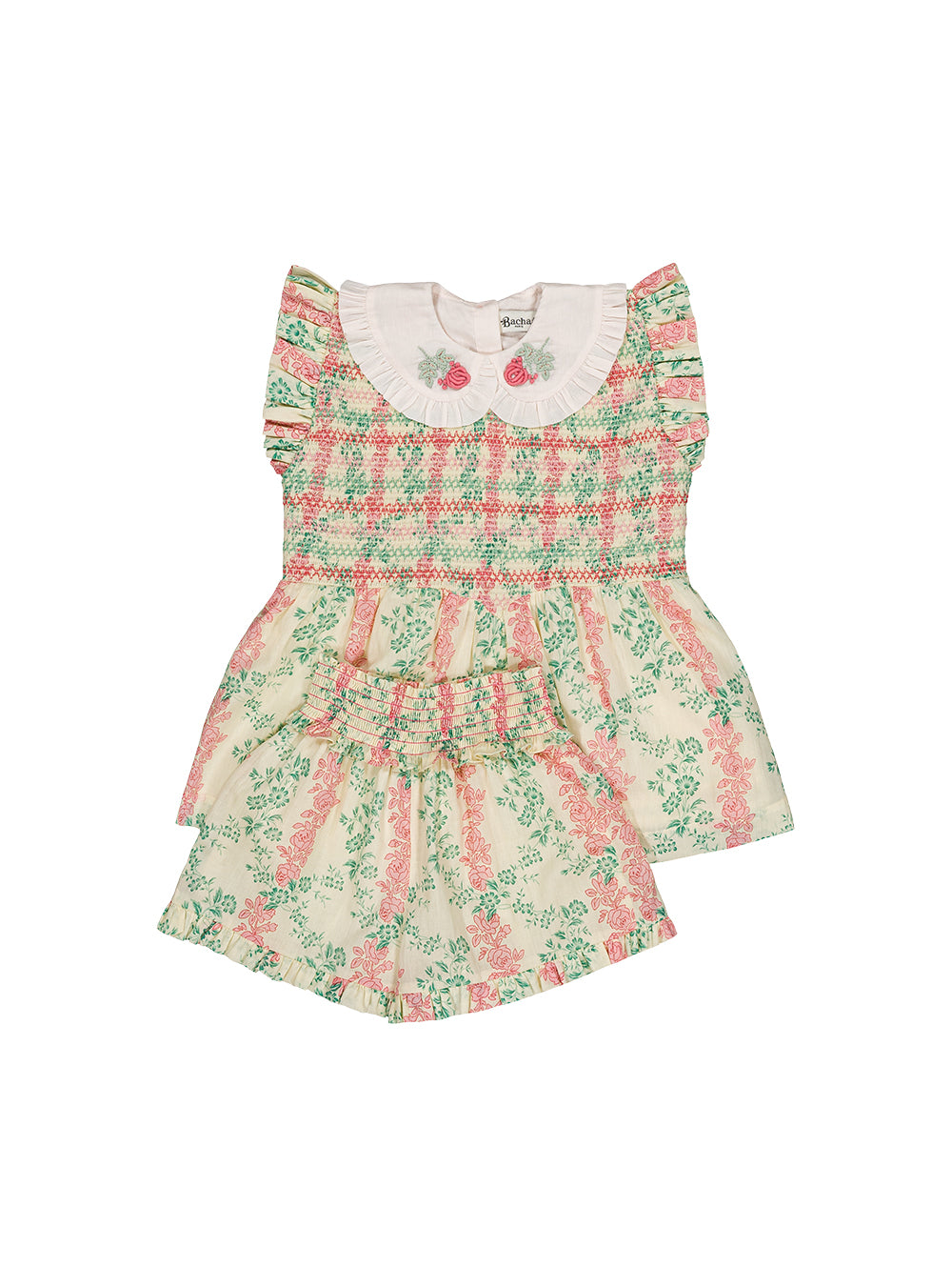 · Vintage-inspired two-piece set in a soft cream base with pink and green floral stripes