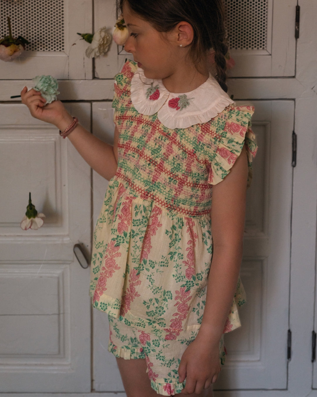 · Hand-smocked bodice with delicate ruffle sleeves and embroidered Peter Pan collar