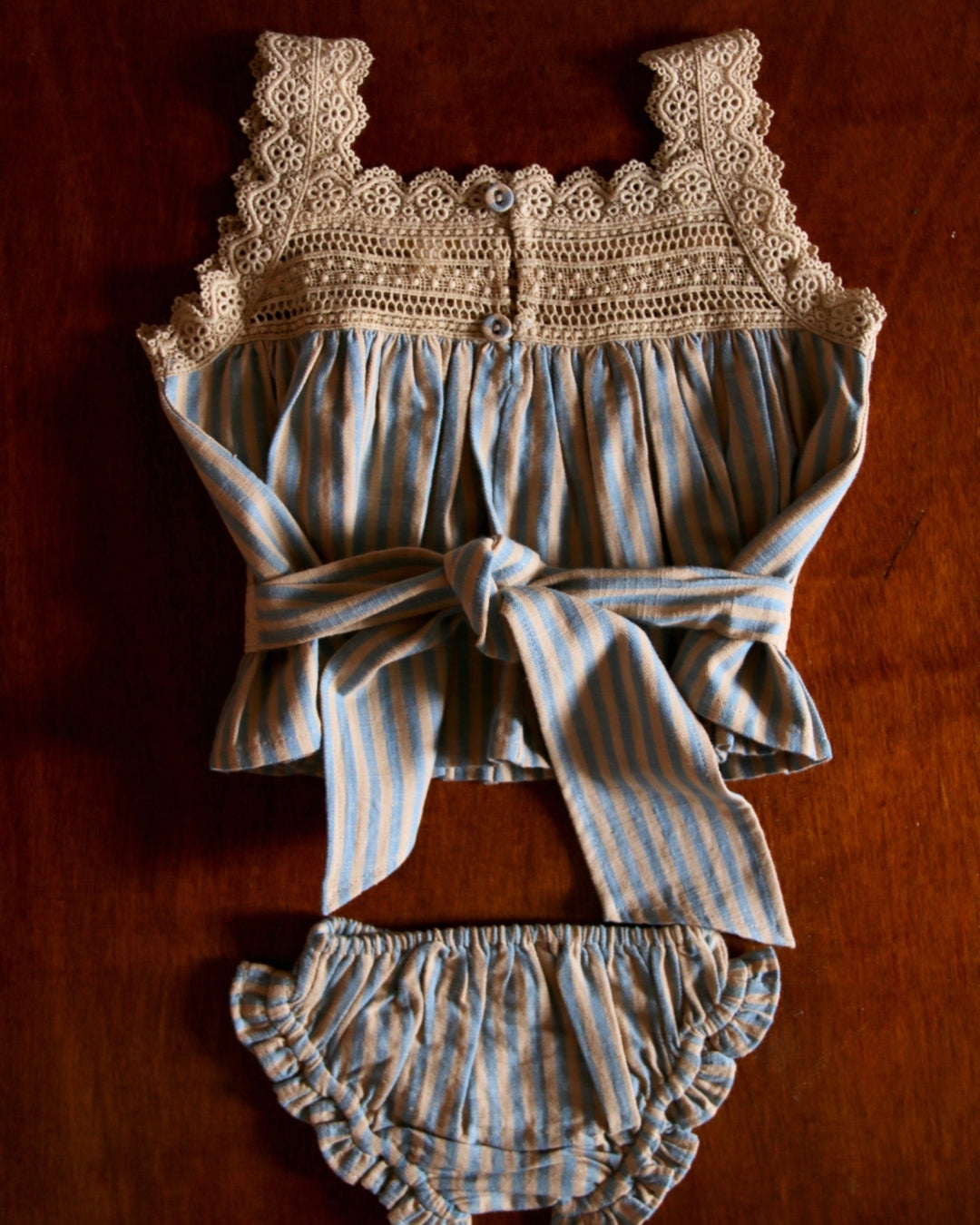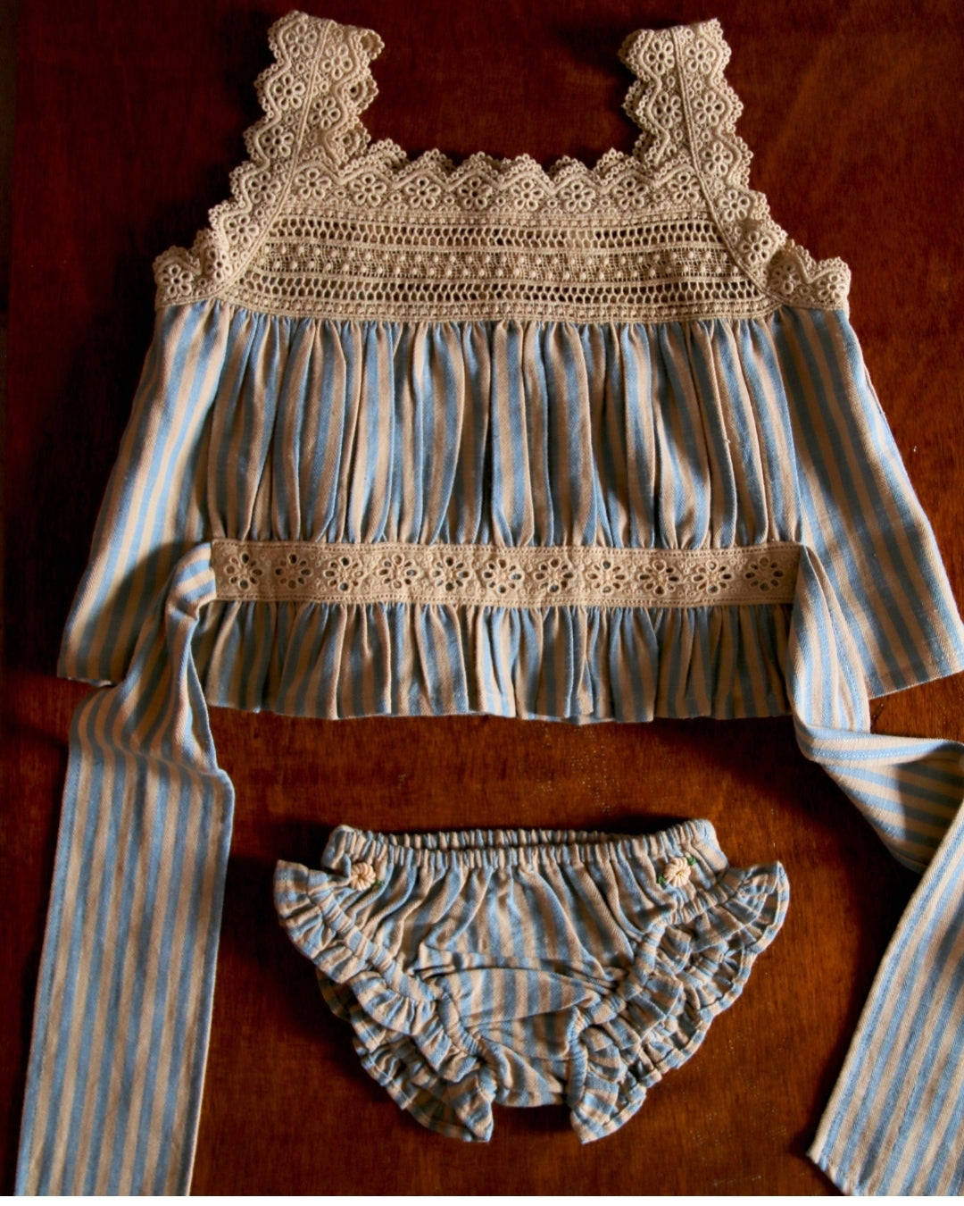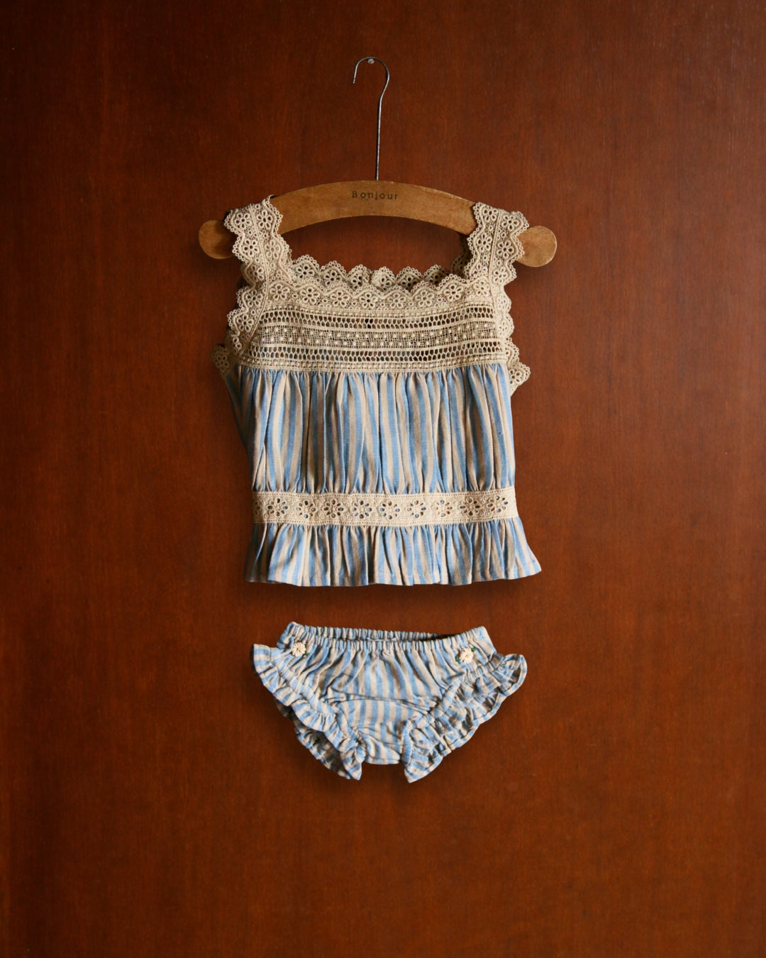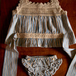 · A delicate two-piece set featuring a softly gathered striped top and matching panty