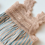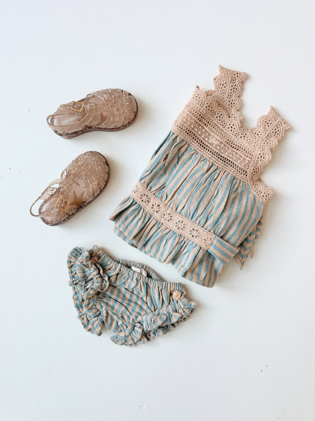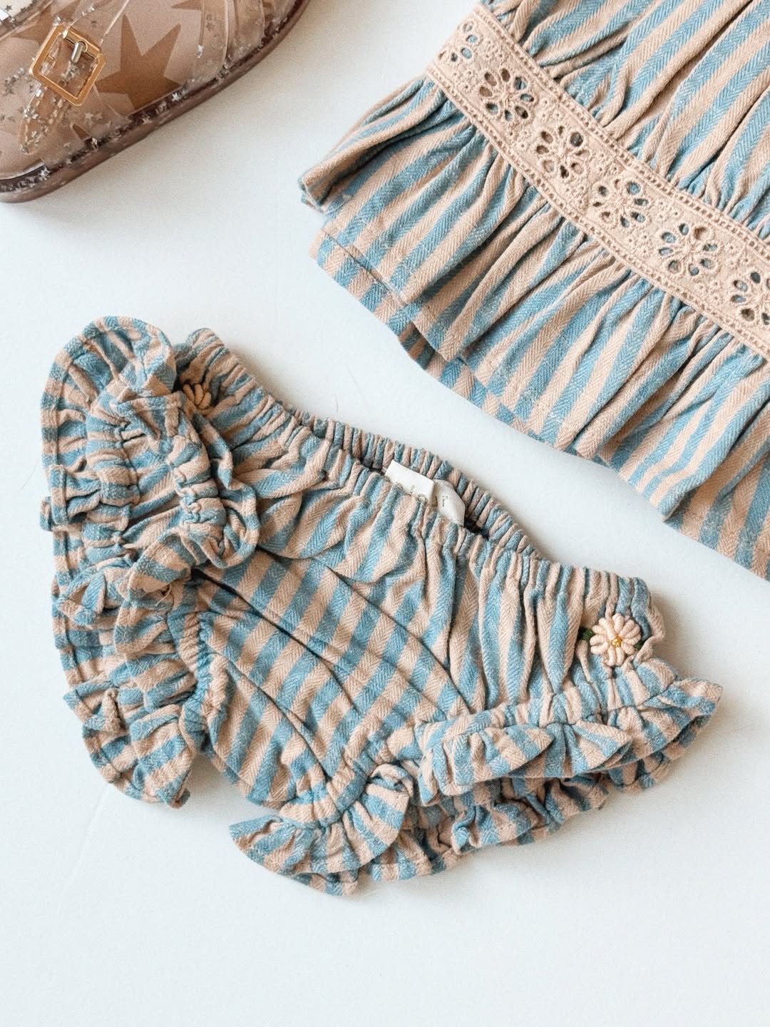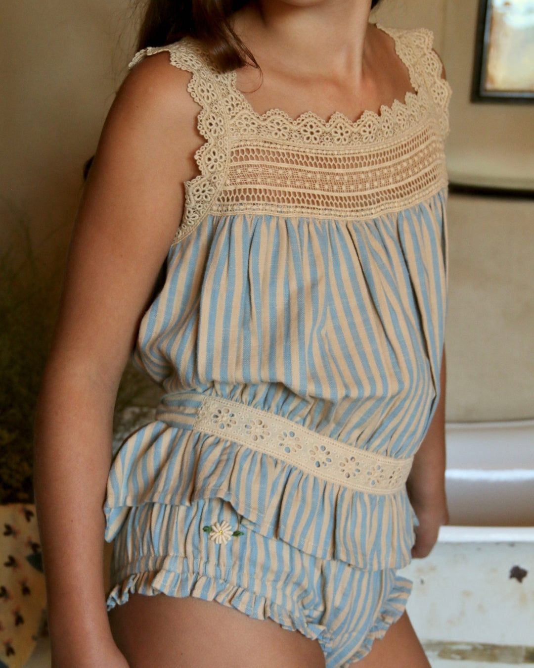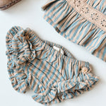 · A delicate two-piece set featuring a softly gathered striped top and matching panty