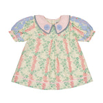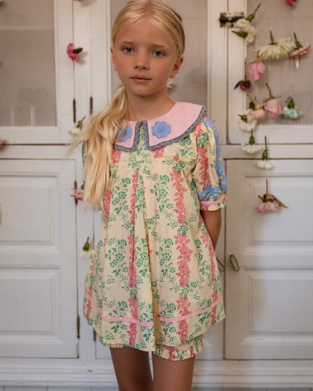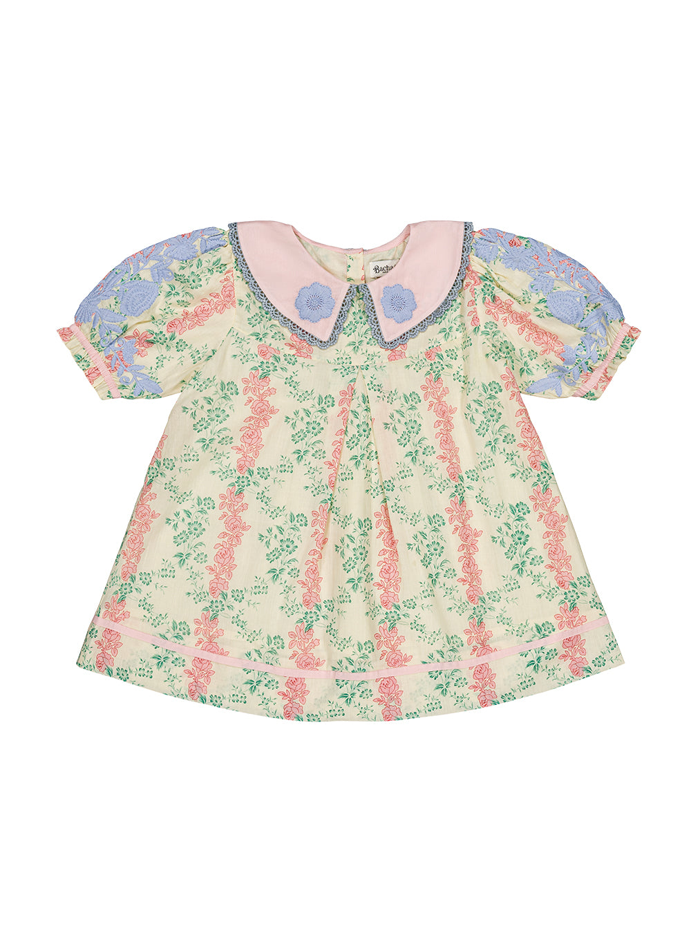 · Puff sleeves featuring delicate blue embroidery panels and pink cuff edging