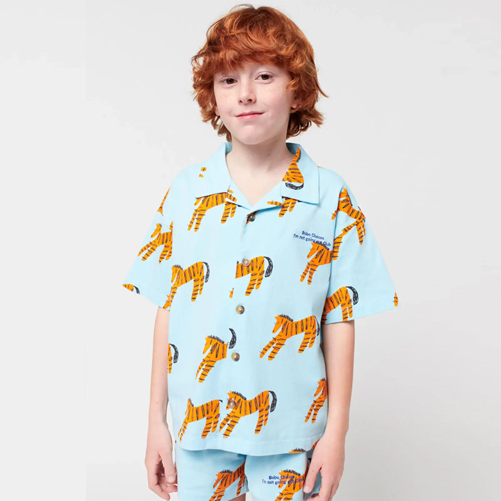 · 자수가 들어간 반팔 버튼업 셔츠와 신축성 허리밴드가 있는 여유로운 반바지